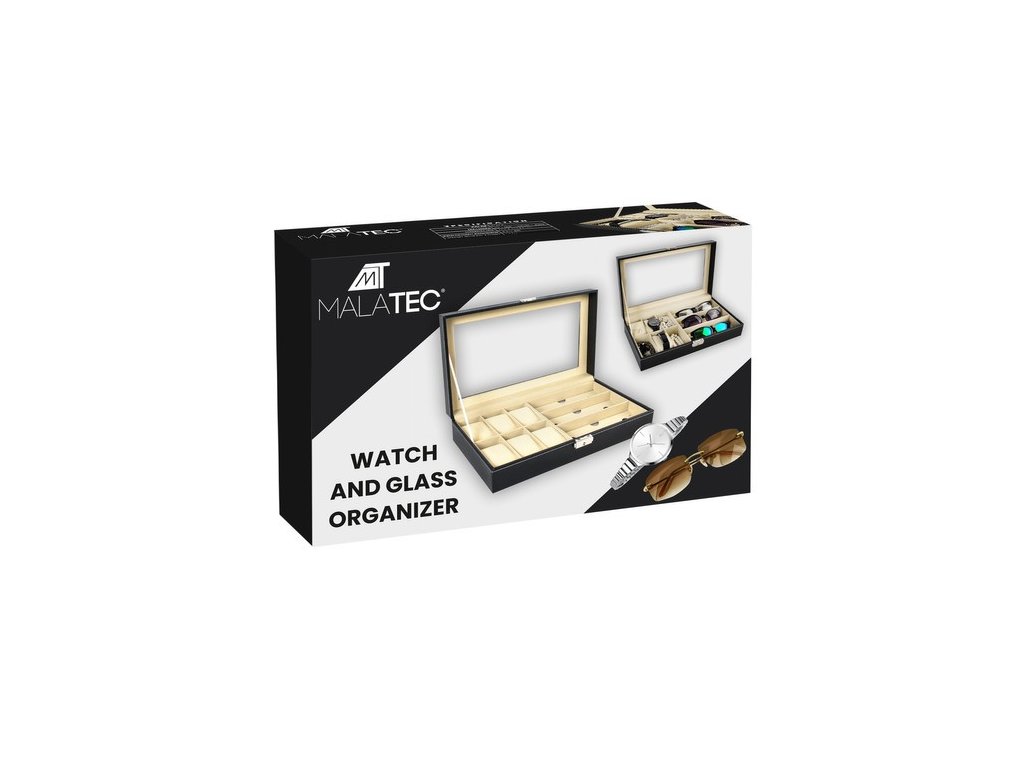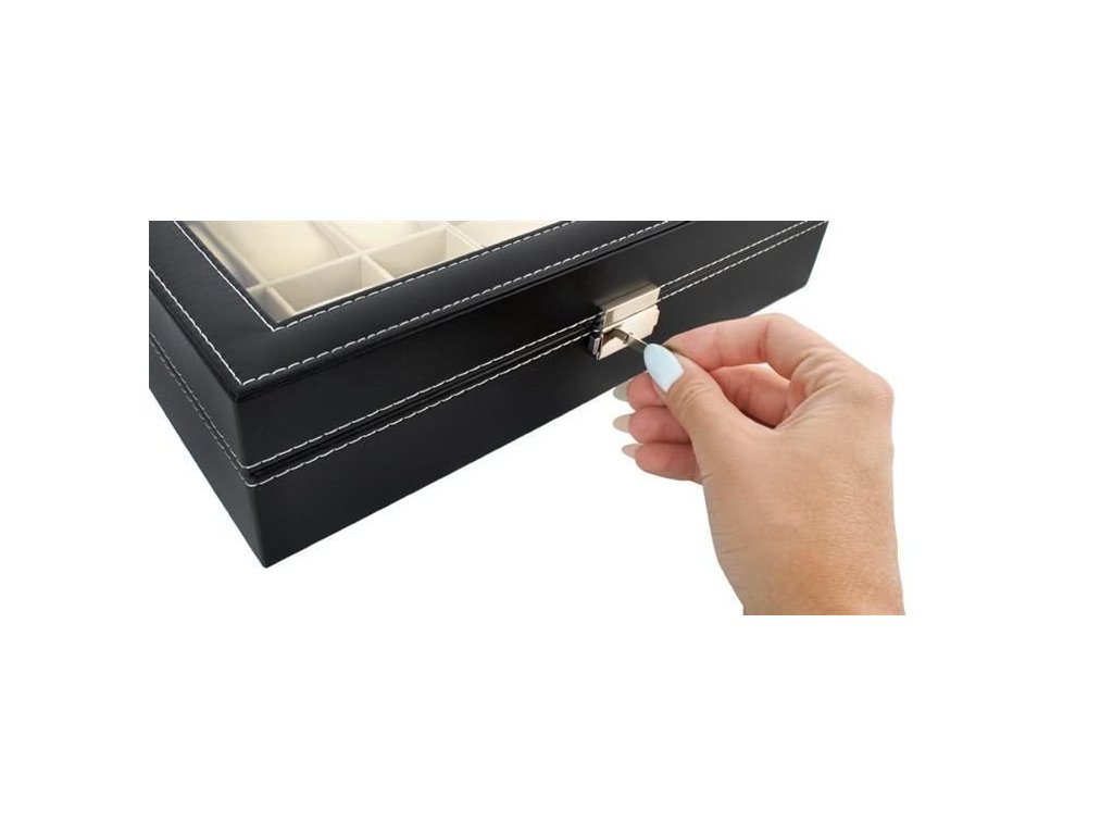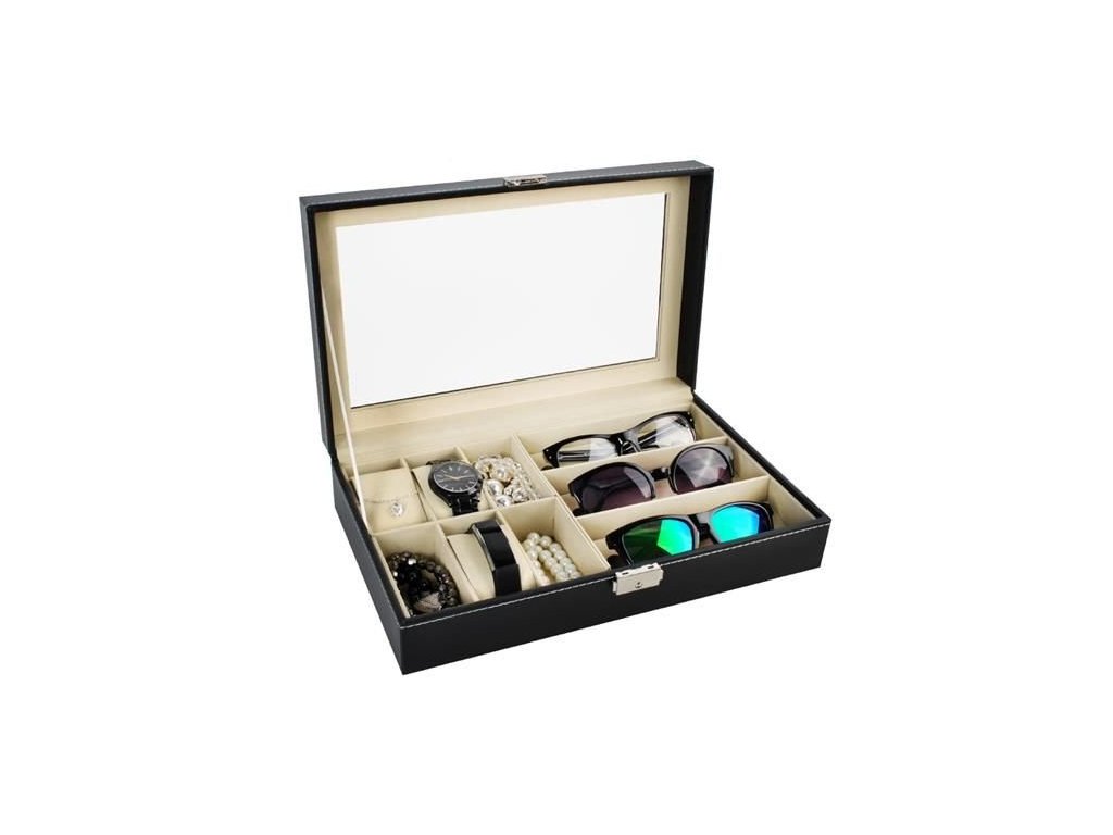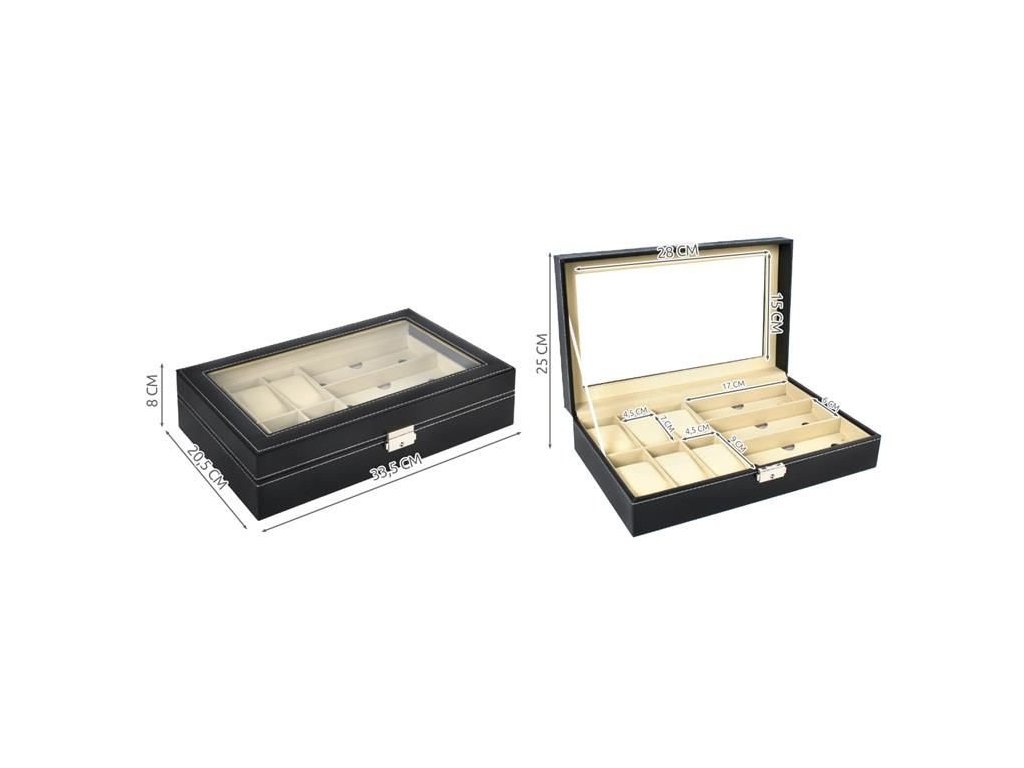 Elegantní krabička má 3 přihrádky na brýle a 6 přihrádek na hodinky, do kterých můžete umístit i další šperky. Krabice má elegantní černou barvu a bílé švy, což celku dodává eleganci a styl . Víko pouzdra je průhledné, takže krabičku na hodinky a brýle lze využít nejen k uložení a udržení pořádku, ale také k elegantnímu vystavení obsahu.
