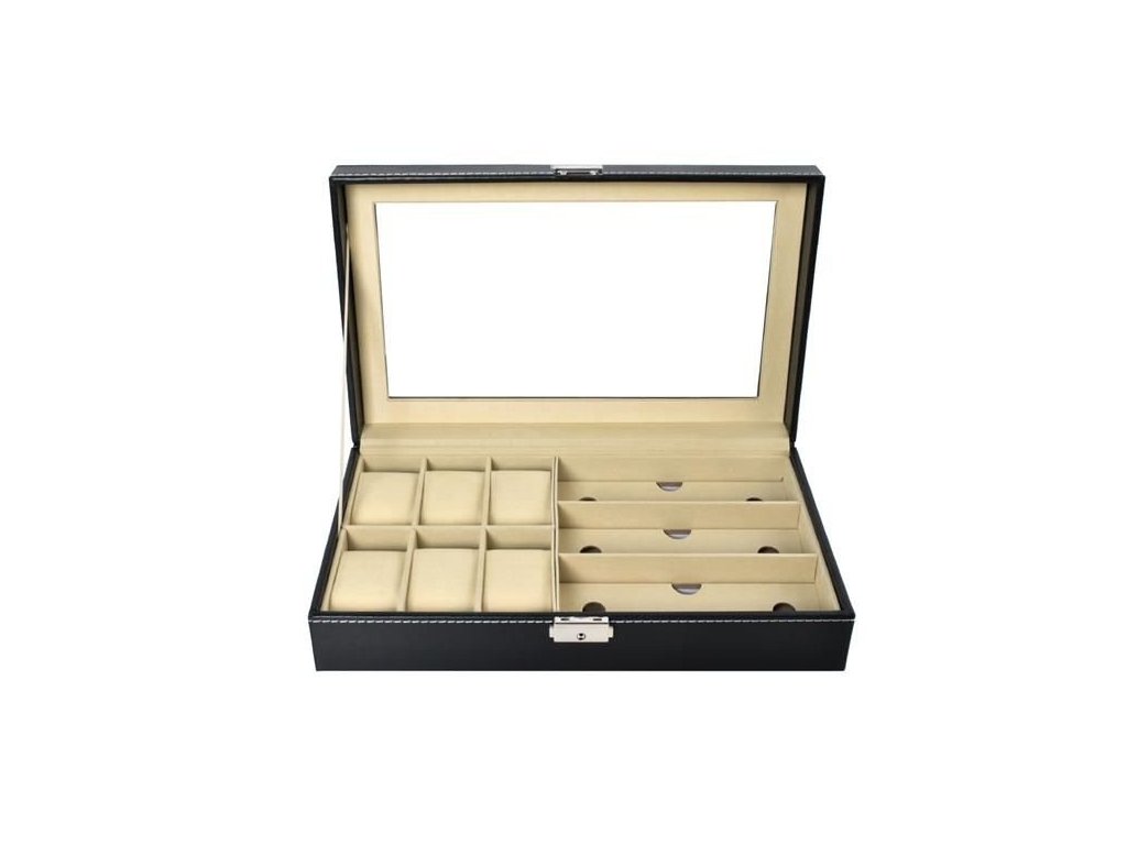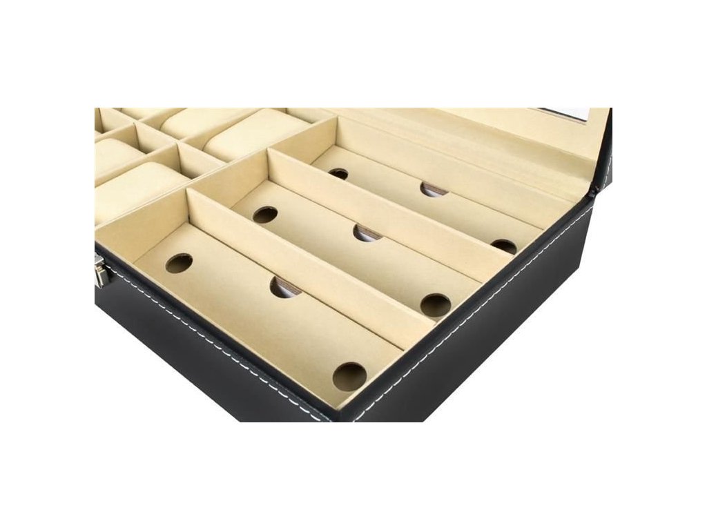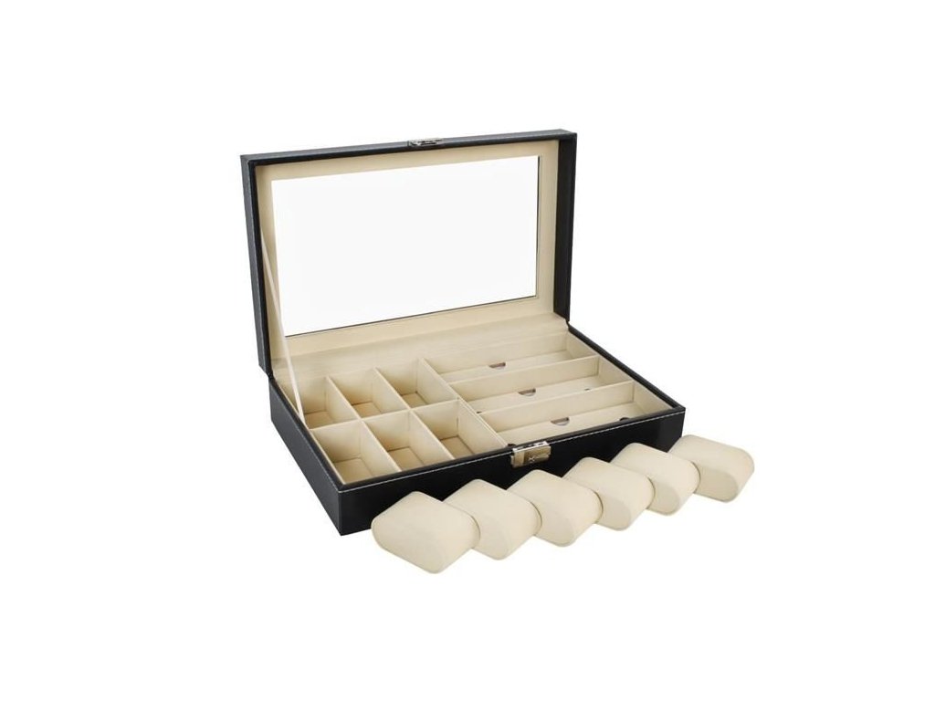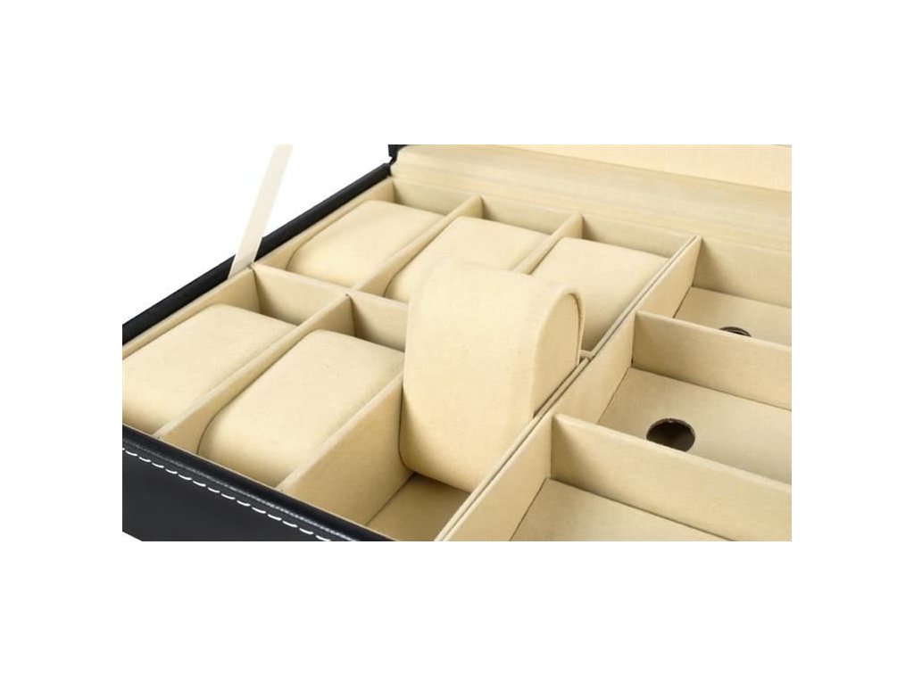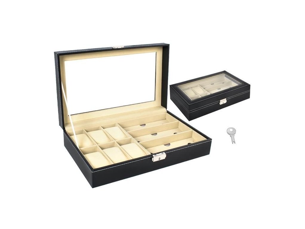 Elegantní krabička má 3 přihrádky na brýle a 6 přihrádek na hodinky, do kterých můžete umístit i další šperky. Krabice má elegantní černou barvu a bílé švy, což celku dodává eleganci a styl . Víko pouzdra je průhledné, takže krabičku na hodinky a brýle lze využít nejen k uložení a udržení pořádku, ale také k elegantnímu vystavení obsahu.