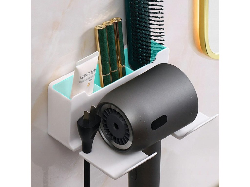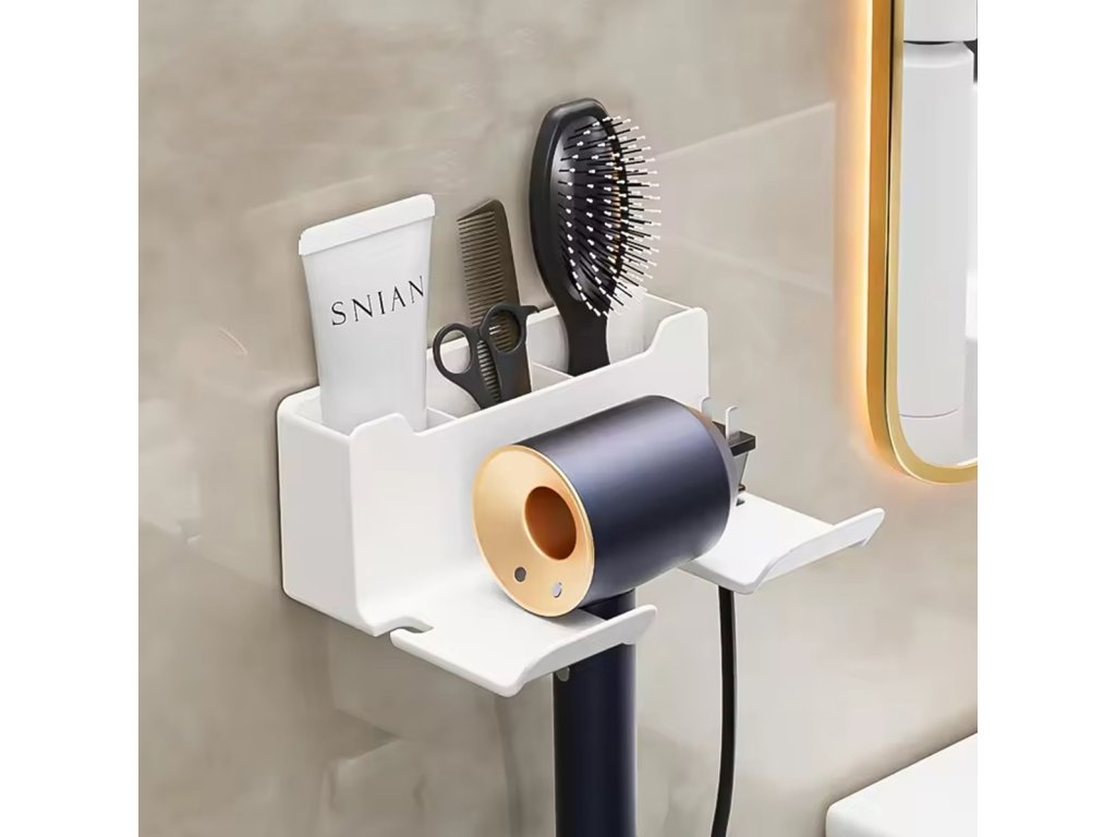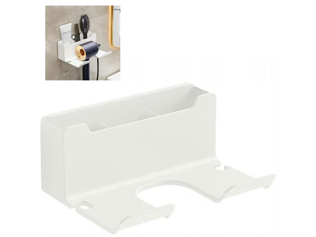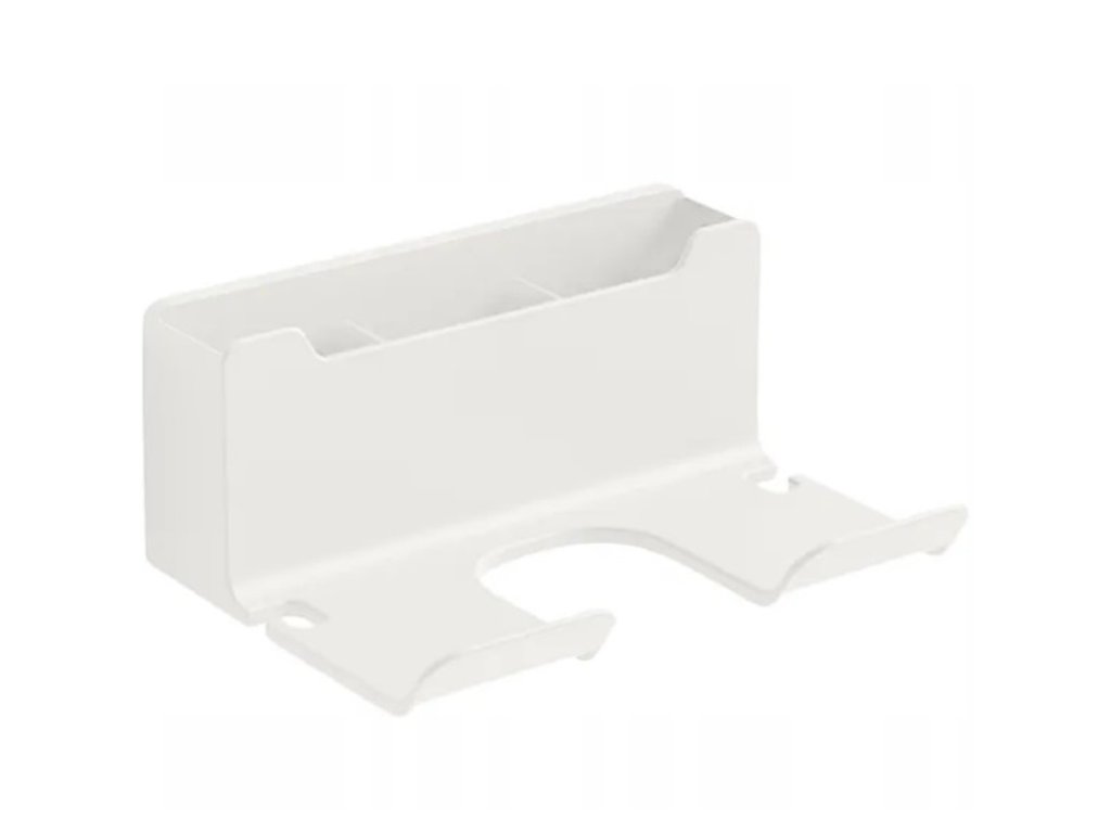 Nástěnný držák na fén. Mimořádně pohodlné a prostorově úsporné řešení. Snadná a neinvazivní instalace pomocí oboustranné pásky. Je vybaven velkým prostorem pro drobnosti a dvěma výřezy pro kabely a také perfektně slouží jako další polička na kosmetiku nebo zubní kartáčky.