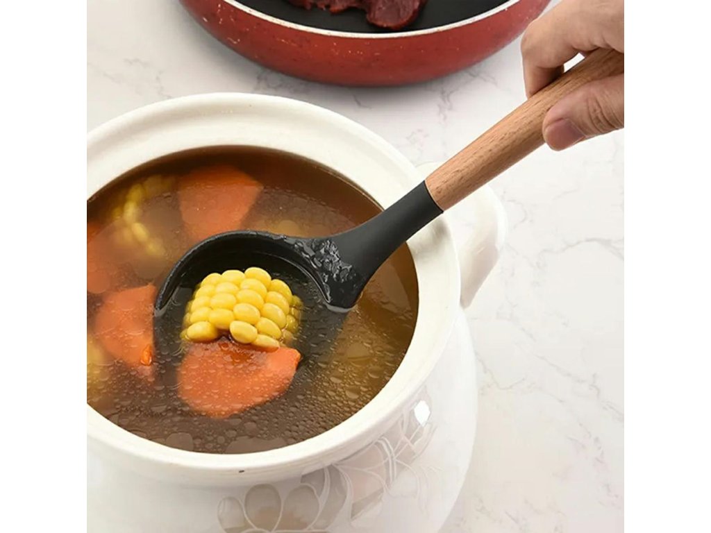 - Materiál (nádobí): dřevo + TPE silikon