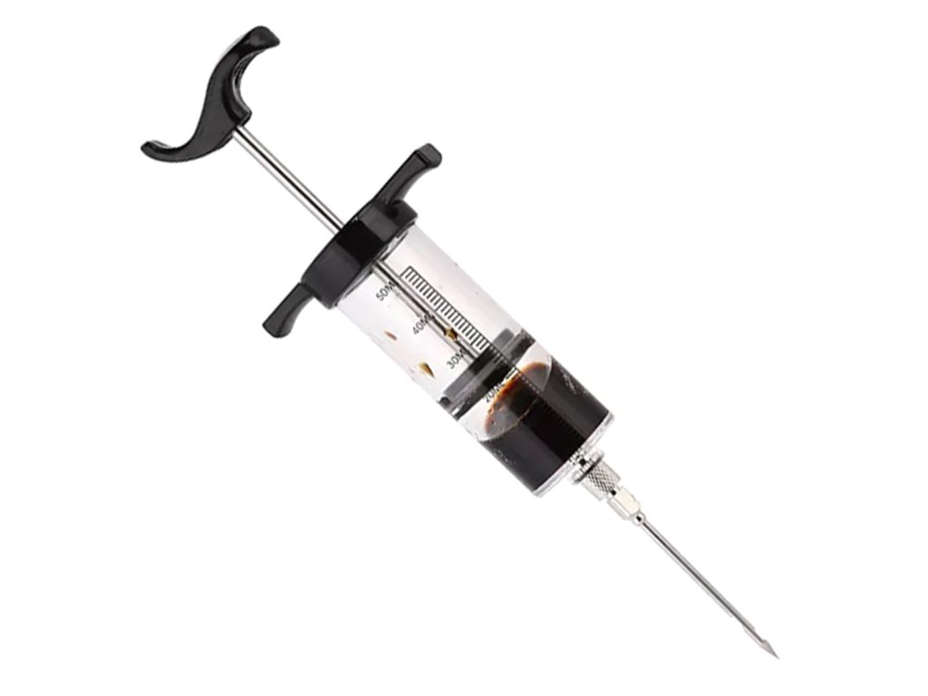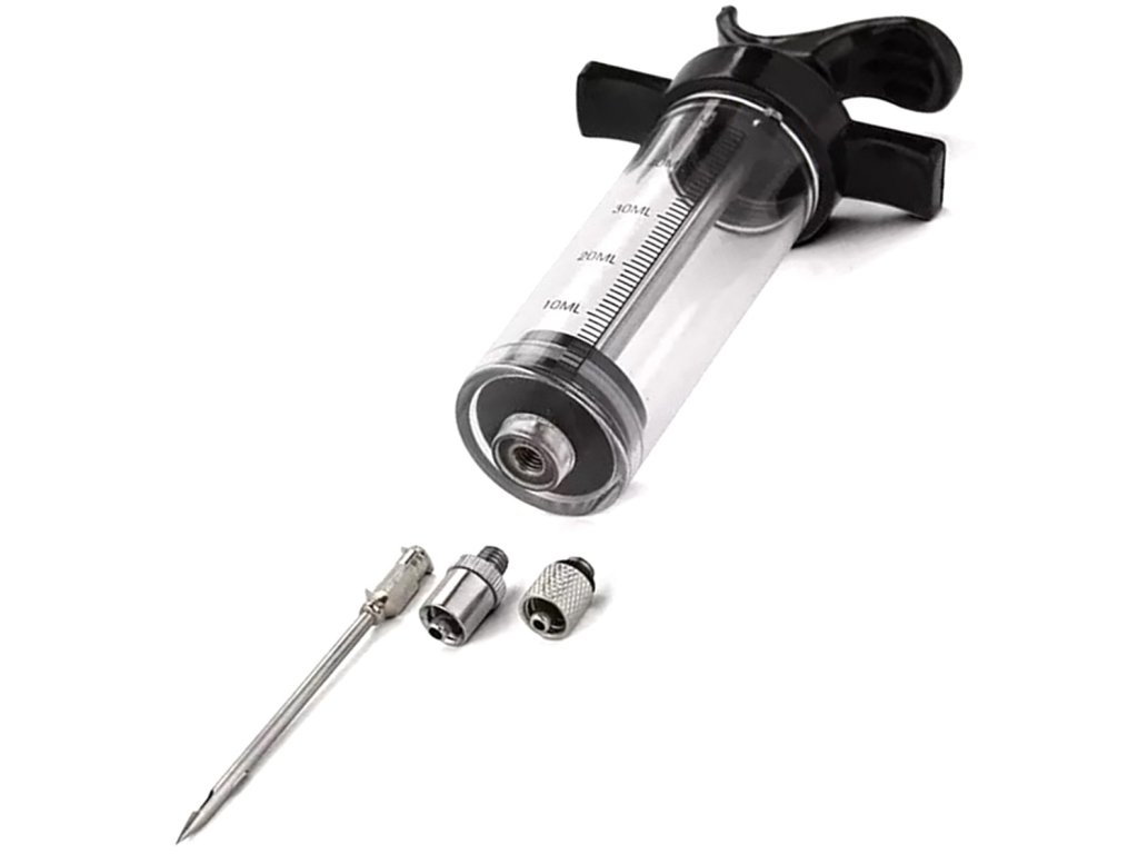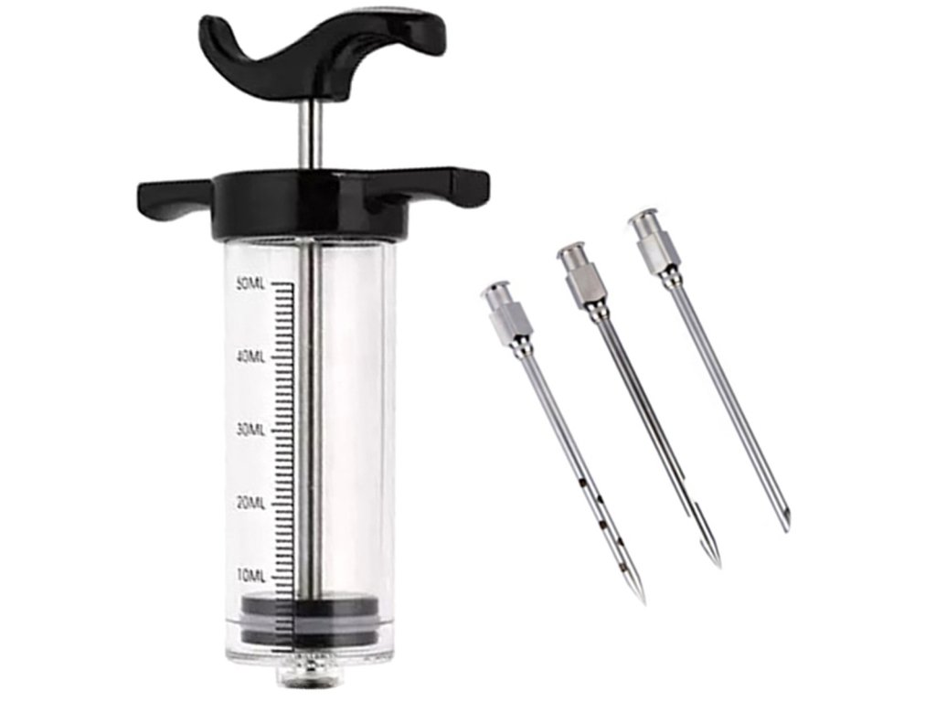 Injektor na maso o objemu 50 ml. Vynikající sada vybavená 3 ocelovými jehlami různých délek. Umožňuje rychle a pohodlně zvýraznit chuť masa vstříknutím marinády, omáčky nebo koření. Nenahraditelná pomůcka v každé kuchyni a udírně .