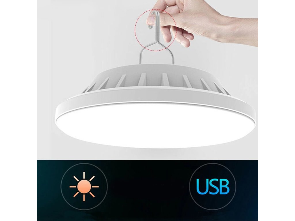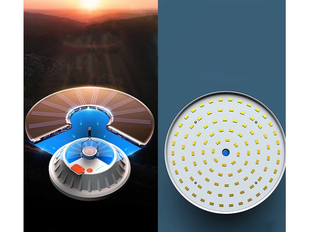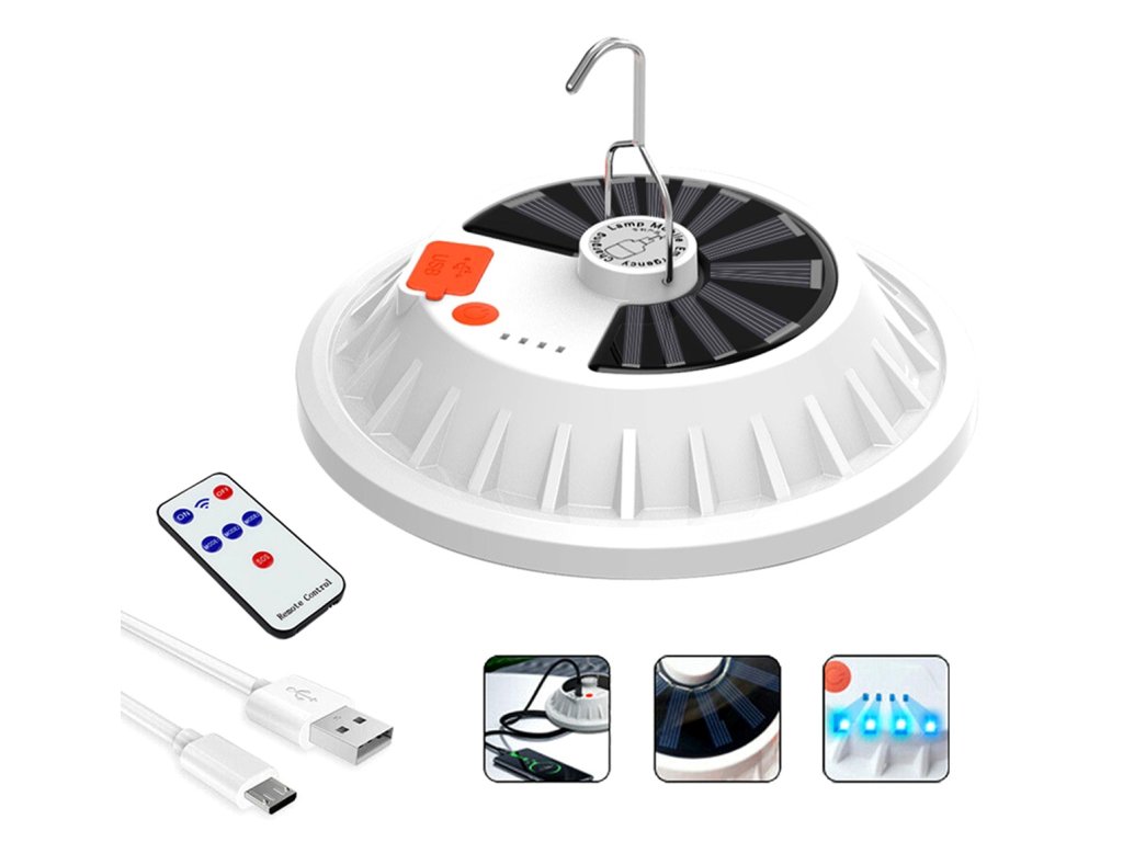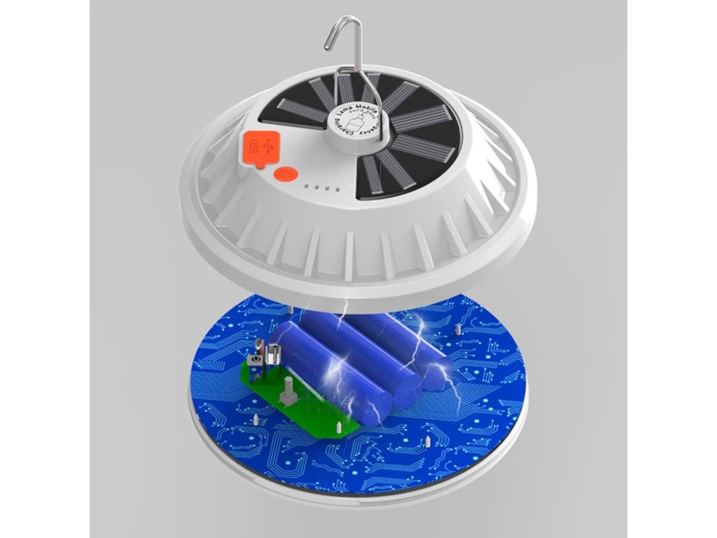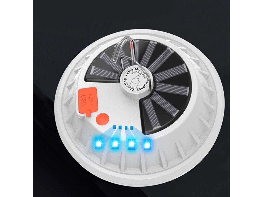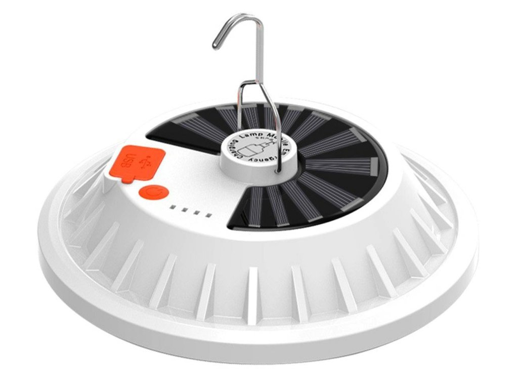 Funkční kempingová lampa napájená vestavěnou baterií a solárním panelem. Lze zavěsit do stanu (vestavěné madlo). Jedná se o silný zdroj světla díky použití LED diod. Lampa je odolná proti prachu, nárazům a stříkající vodě (IP65) a lze ji používat venku. Má několik režimů svícení a nastavitelný výkon svícení. Vestavěný USB port umožňuje nabíjet další zařízení (např.