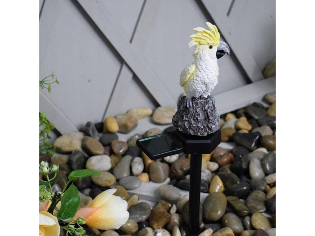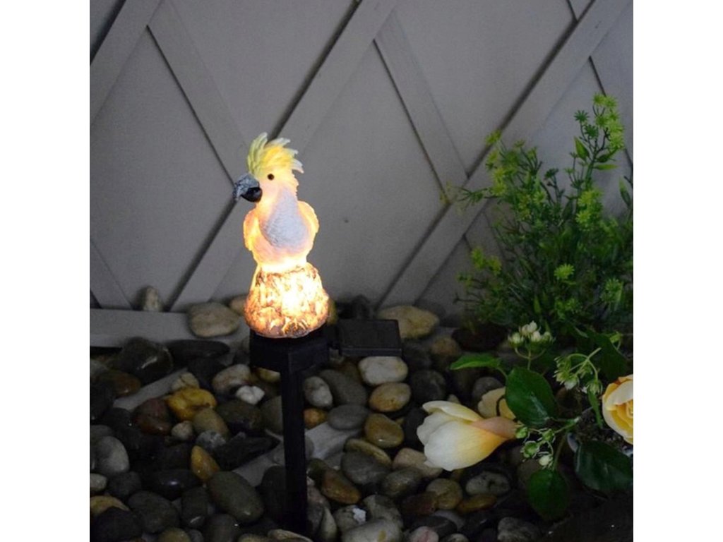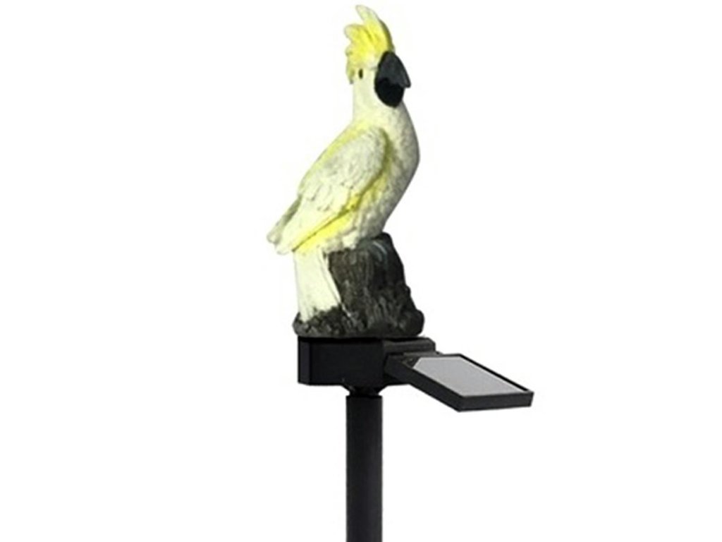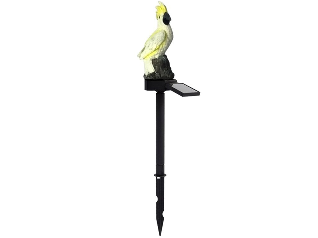 Neobvyklá, solární LED zahradní lampa ve tvaru papouška kakadu. Dokonalý dekorativní prvek. Lampa je na solární pohon, který využívá solární panel k nabíjení vestavěné baterie. Zařízení se automaticky zapne při setmění (je vybaveno soumrakovým senzorem) a plně nabitá baterie vystačí až na 8 hodin nepřetržitého provozu. Lampa má LED diodu, která vydává bílé světlo. Silný hrot umožňuje rychlou a bezpečnou instalaci lampy do země, zatímco vodotěsné pouzdro zaručuje bezproblémové použití bez ohledu na povětrnostní podmínky.