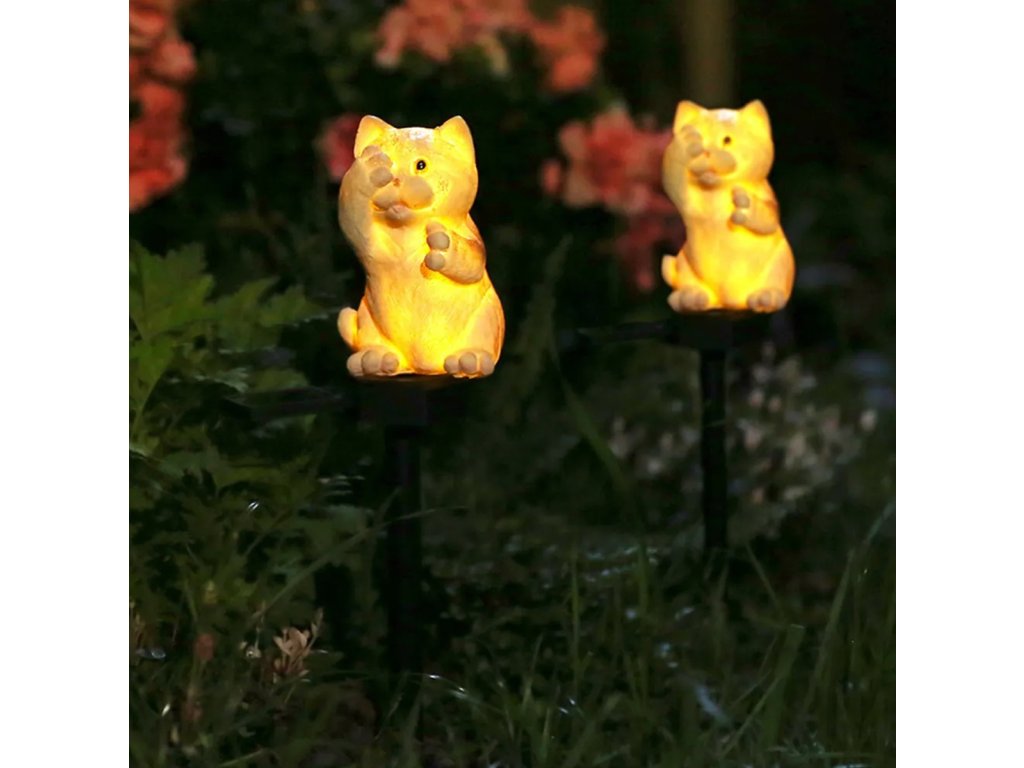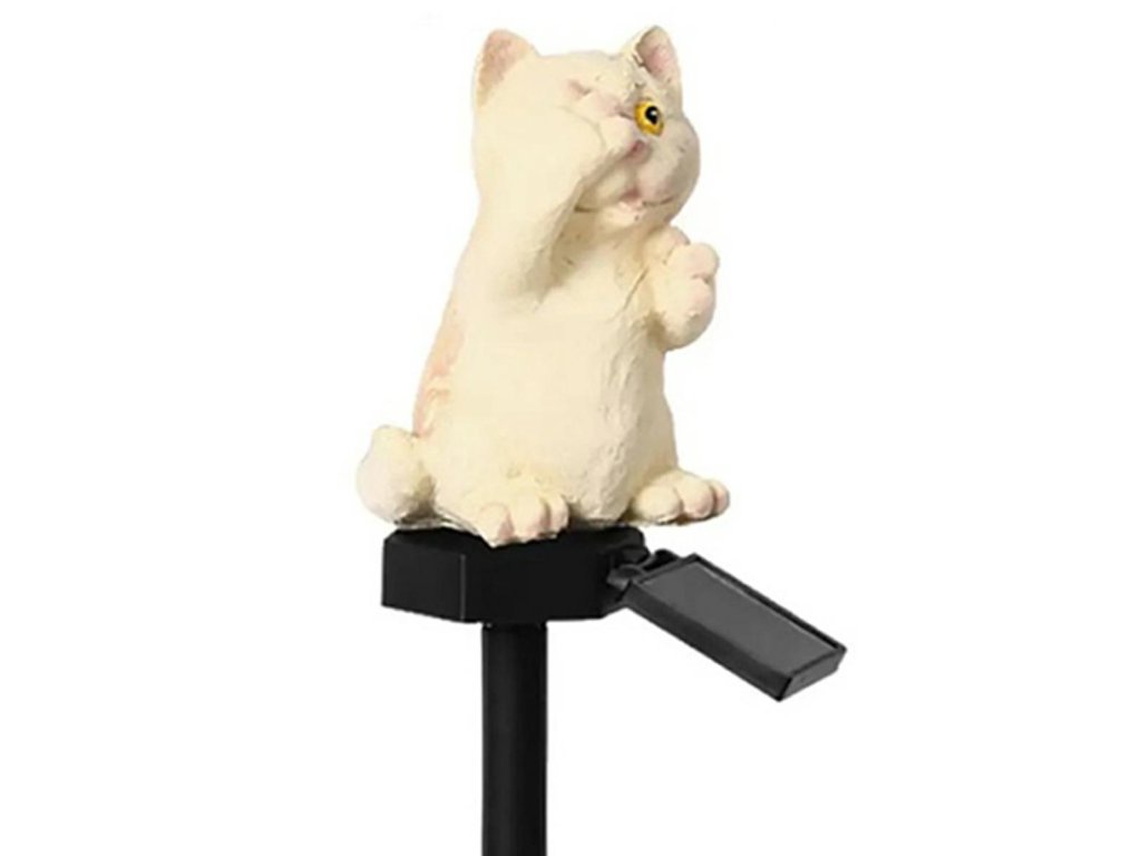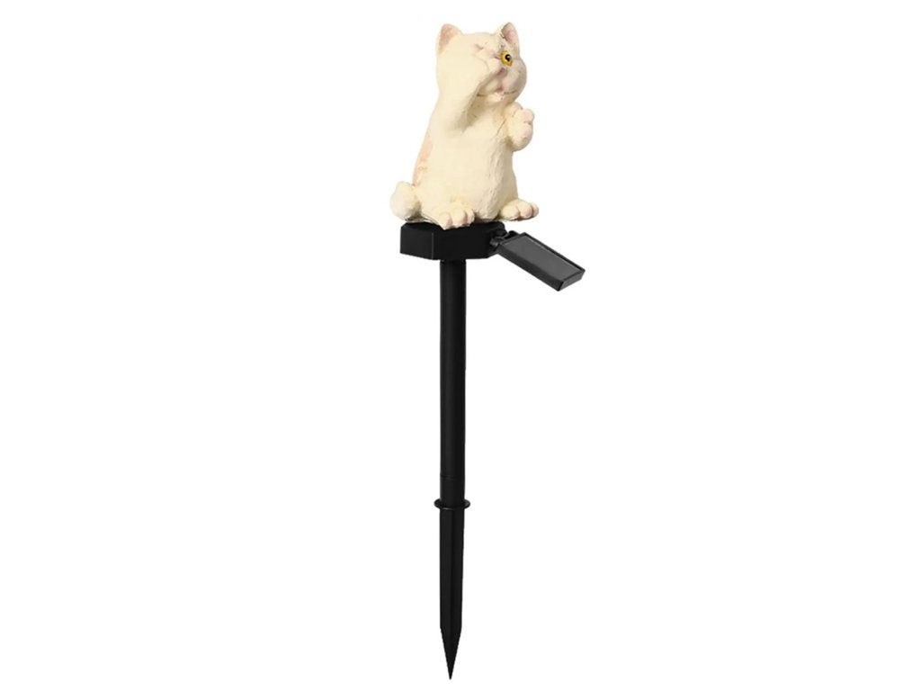 Neobvyklá, solární LED zahradní lampa ve tvaru kočky. Dokonalý dekorativní prvek. Lampa je na solární pohon, který využívá solární panel k nabíjení vestavěné baterie. Zařízení se automaticky zapne při setmění (je vybaveno soumrakovým senzorem) a plně nabitá baterie vystačí až na 8 hodin nepřetržitého provozu. Lampa má LED diodu vyzařující teplé bílé světlo. Silný hrot umožňuje rychlou a bezpečnou instalaci lampy do země, zatímco vodotěsné pouzdro zaručuje bezproblémové použití bez ohledu na povětrnostní podmínky.