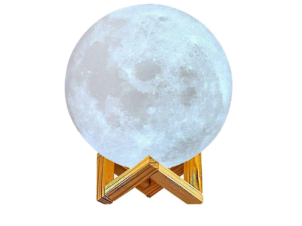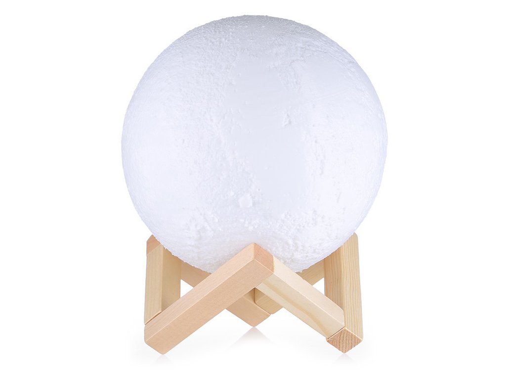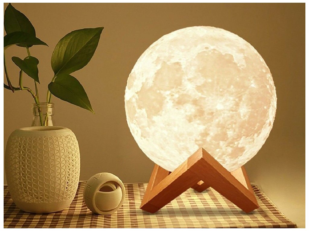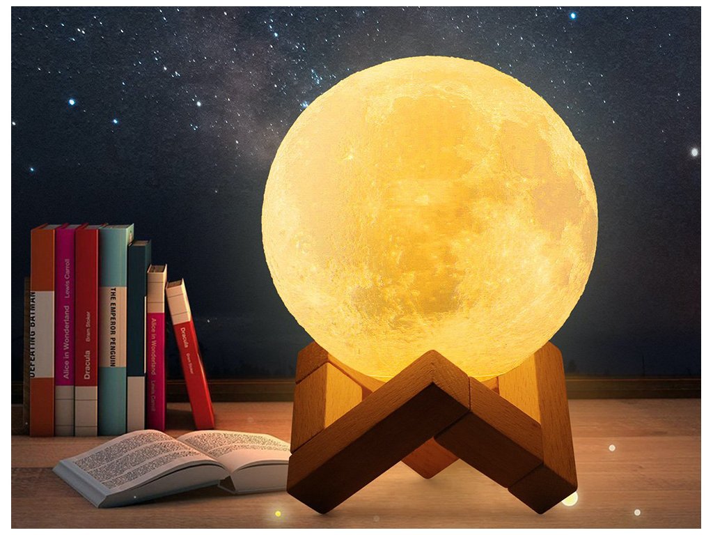 Noční lampička v nápadném tvaru měsíce. V místnosti, např. v ložnici, dětském pokoji nebo obývacím pokoji, navodí kouzelnou náladu. Byla vyrobena technologií 3D, díky níž velmi realisticky reprodukuje měsíci. Po zapnutí lampa poskytuje atmosférické světlo v libovolné zvolené barvě. Stisknutím tlačítka můžeme zvolit libovolnou variantu osvětlení .