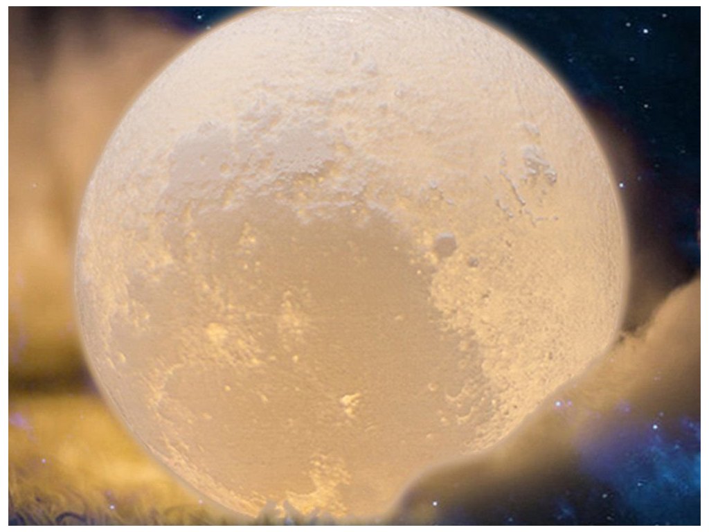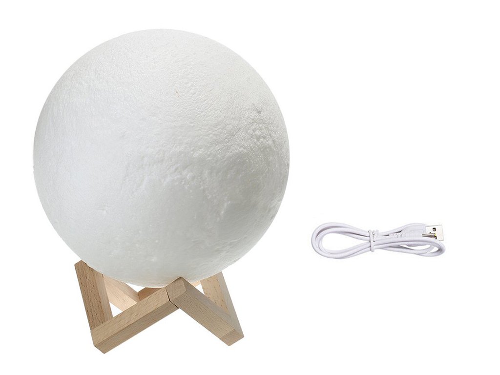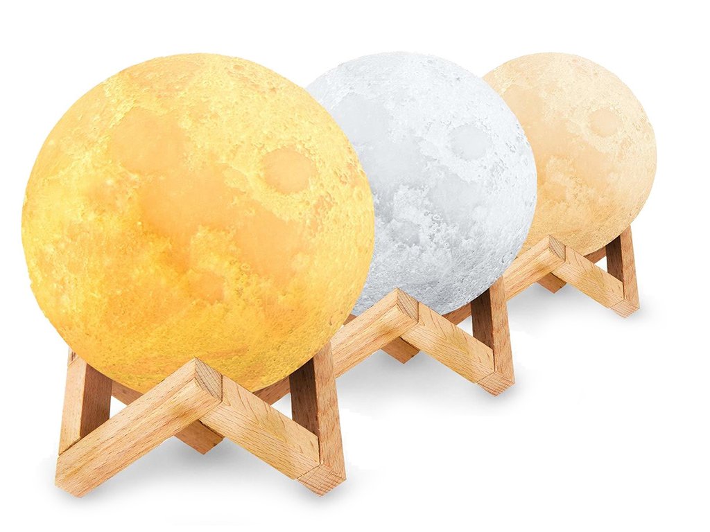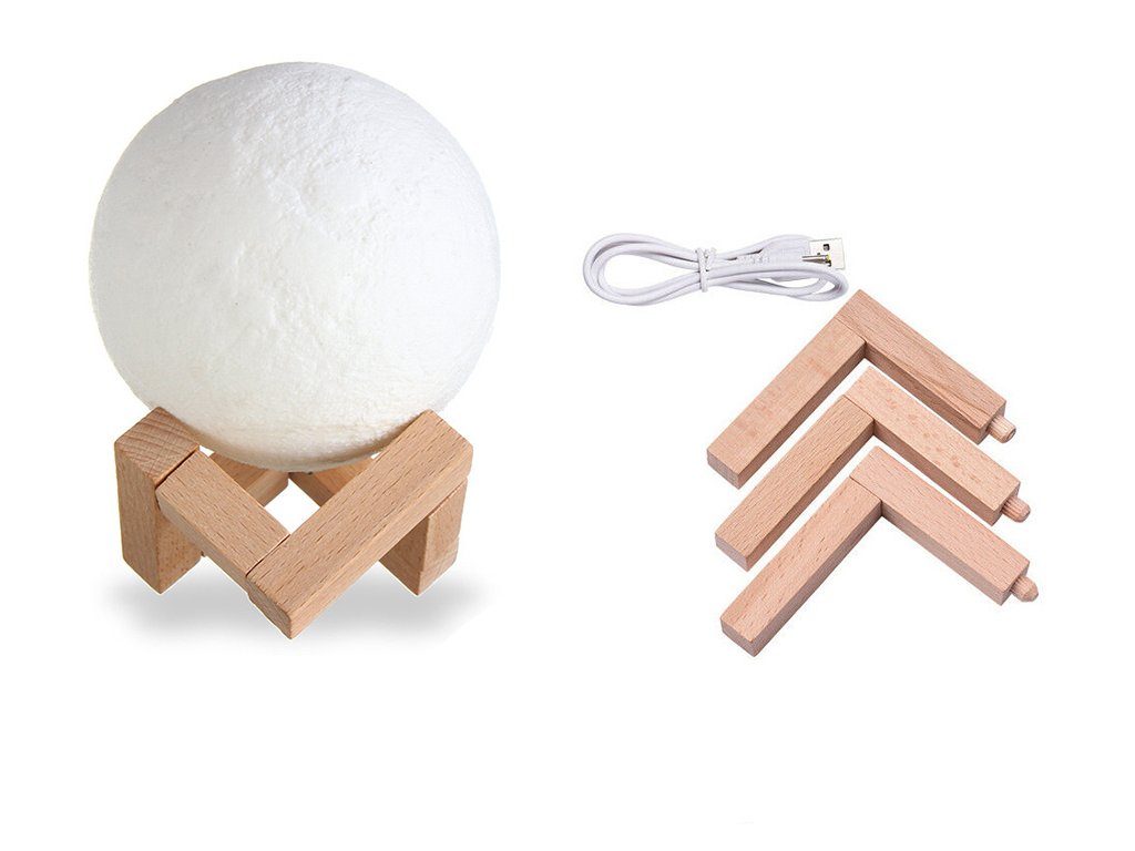 Noční lampička v nápadném tvaru měsíce. V místnosti, např. v ložnici, dětském pokoji nebo obývacím pokoji, navodí kouzelnou náladu. Byla vyrobena technologií 3D, díky níž velmi realisticky reprodukuje měsíci. Po zapnutí lampa poskytuje atmosférické světlo v libovolné zvolené barvě. Stisknutím tlačítka můžeme zvolit libovolnou variantu osvětlení .