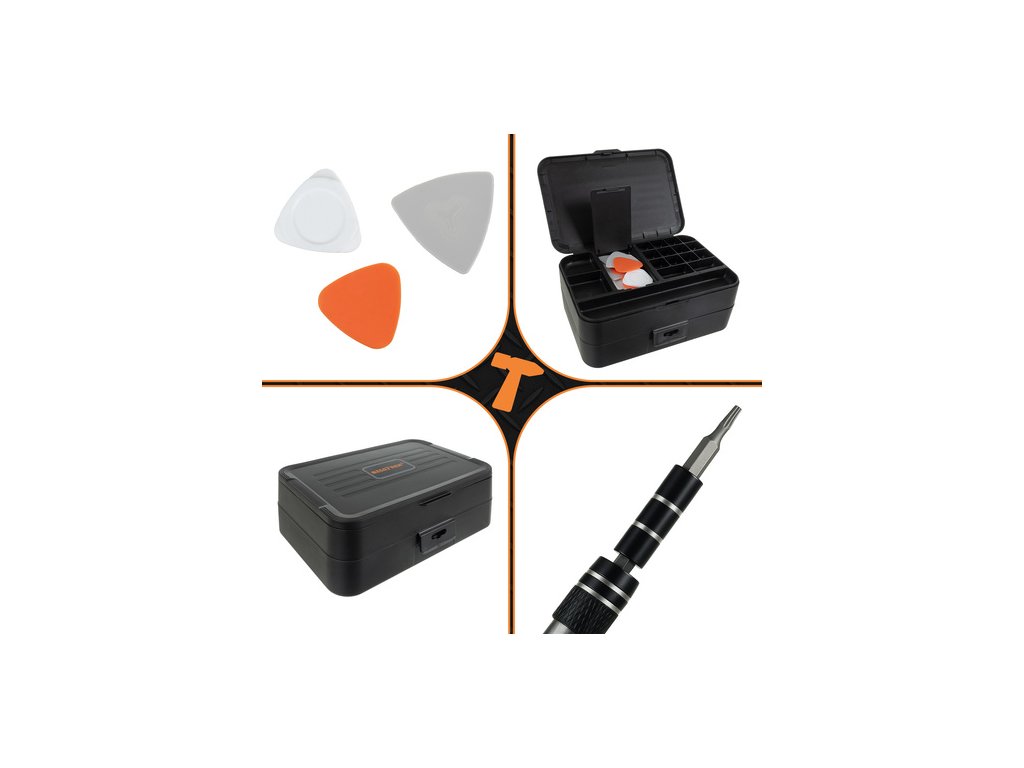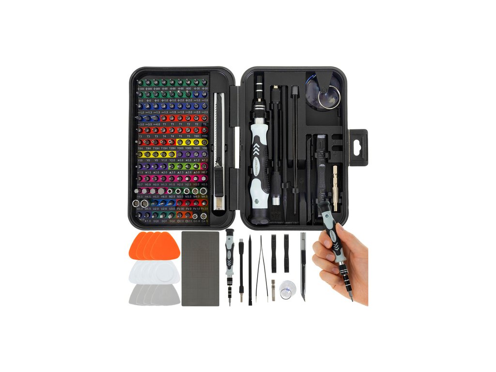 - 108 ks bitů šroubováků CRV: (PH0000 až PH2, ploché: SL1 až SL4, šestihranné (Hex): H0,7 až H6,0, objímky: M2,5 až M5,5, G3,8, G4,5, Torx a Torx s otvorem: T1 až T20H, trojkřídlé, pentalobe, trojúhelníkové, čtvercové, Pozidriv, tvar U atd., vyhazovače SIM karet: SIM0,8, SIM1,0, distanční bity: 2,0, 2,5)