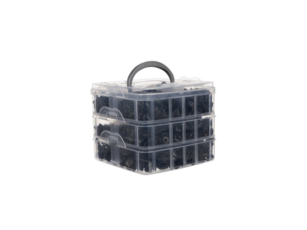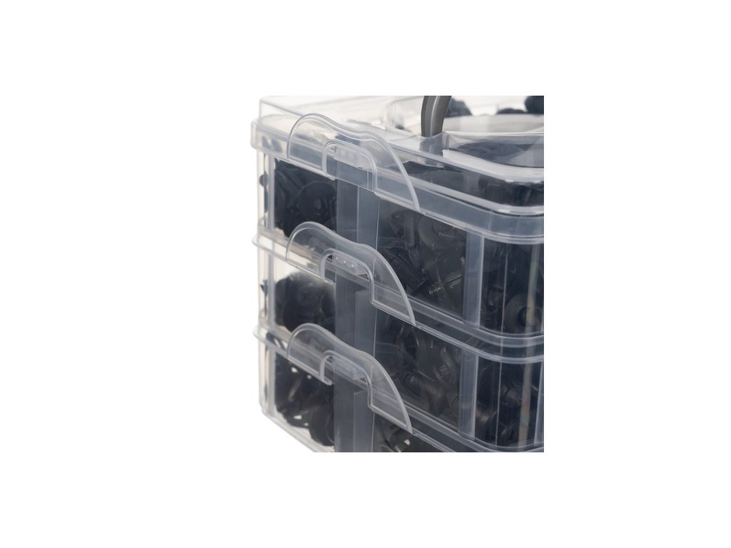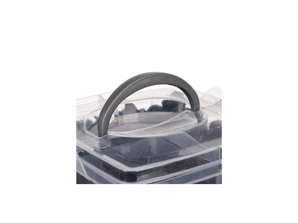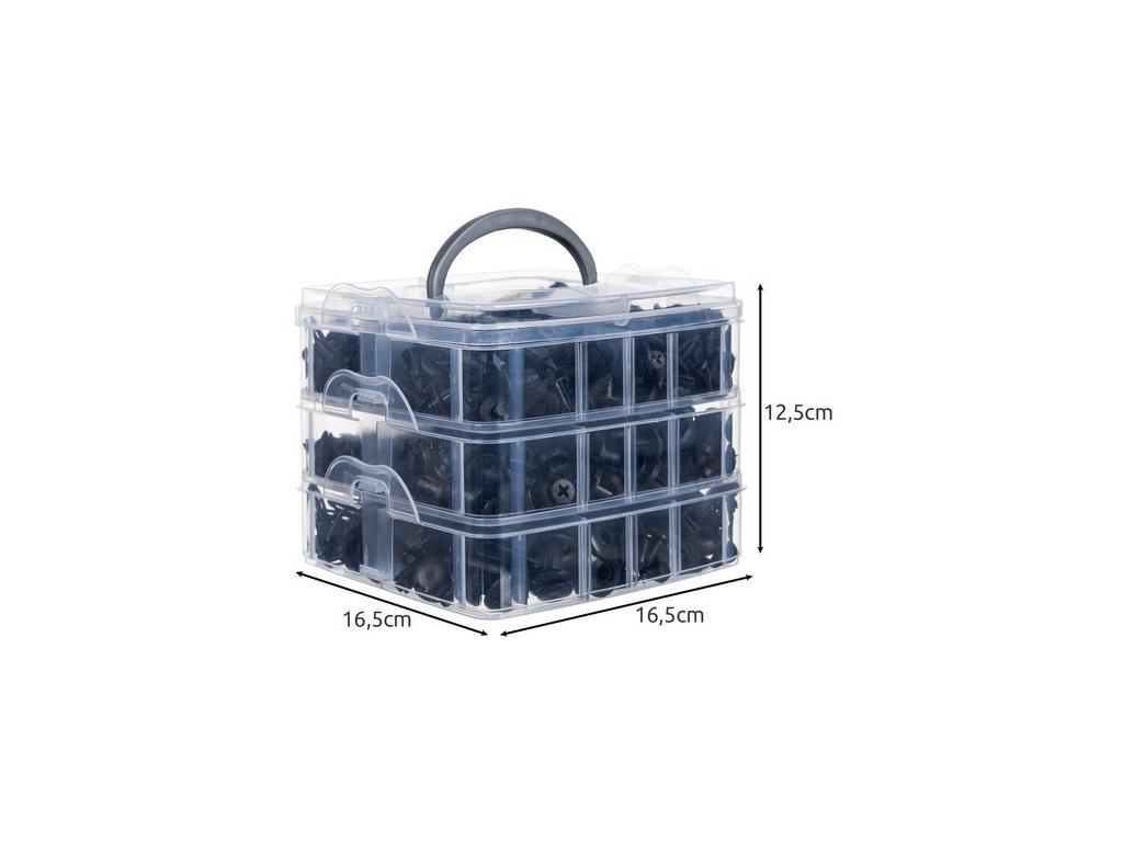 - Praktický plastový box Sada autosvorek je umístěna v praktickém kufříku plastový box také z PP , který usnadňuje organizaci a skladování špendlíky . Krabice se skládá z tři úrovně spojené pevným uzávěrem , který zajišťuje bezpečné uložení prvků. Každá úroveň boxu obsahuje přihrádky oddělující různé typy a velikosti klipů , což umožňuje rychlý a snadný přístup ke klipům, které potřebujete při práci. V horní části krabice je jeden šikovná rukojeť , která usnadňuje přenášení sady.