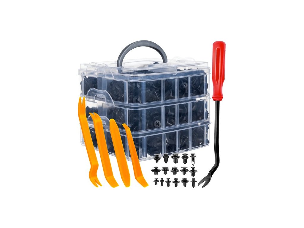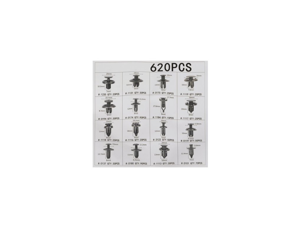- SPECIFIKACE: materiál: PP, ABS, železo; značka vozu: univerzální; použití: univerzální; počet pinů: 620 ks; počet typů čepů: 16; rozměry pouzdra: 16,5 x 16,5 x 12,5cm; hmotnost: 0,82 kg; hmotnost v balení: 0,92 kg V ceně: 620 ks manžetových knoflíčků; 4 ks; nástroj na odstranění klipu 1 ks; pouzdro 1ks