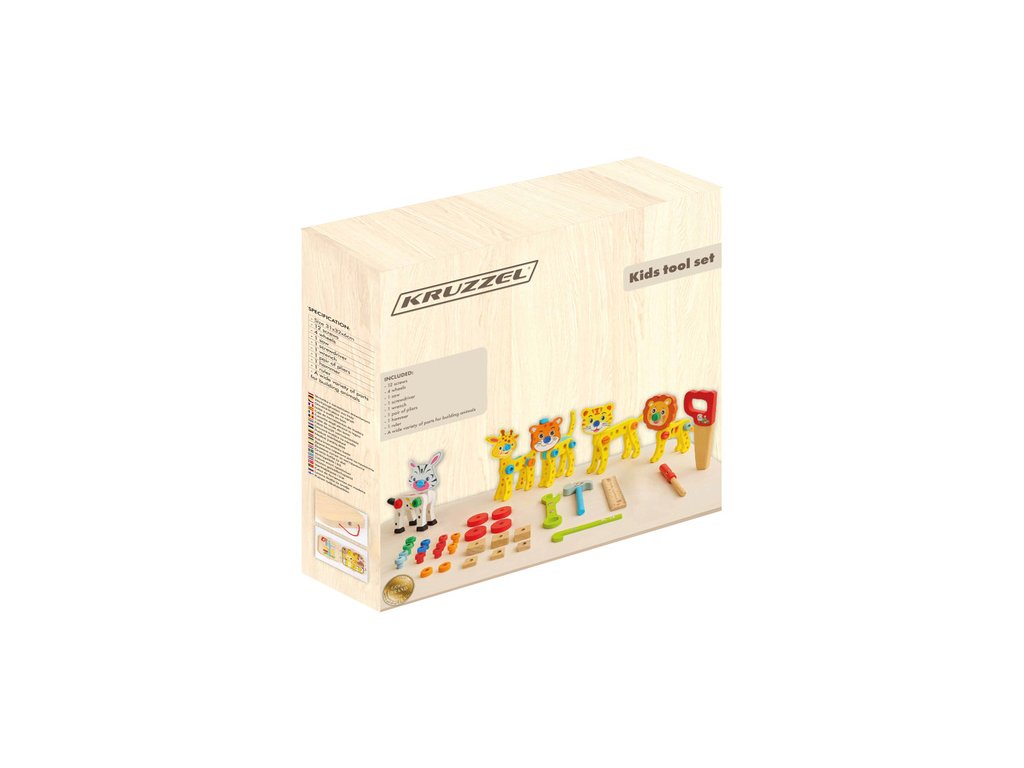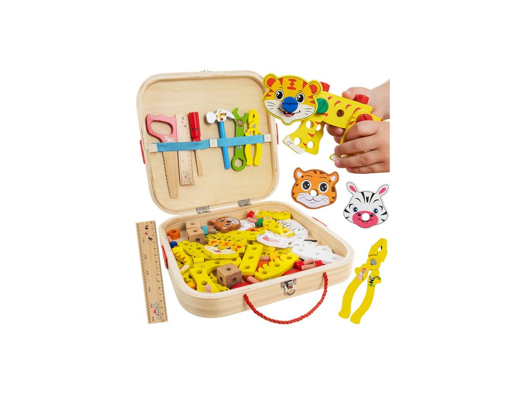 Dřevěná bedna na nářadí pro děti, stavebnice pro kutily + nářadí, stavění zvířátek, robotická vozidla - zábavné učení v jednom KRUZZEL!