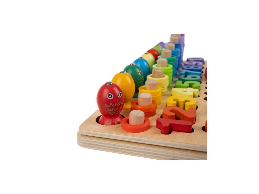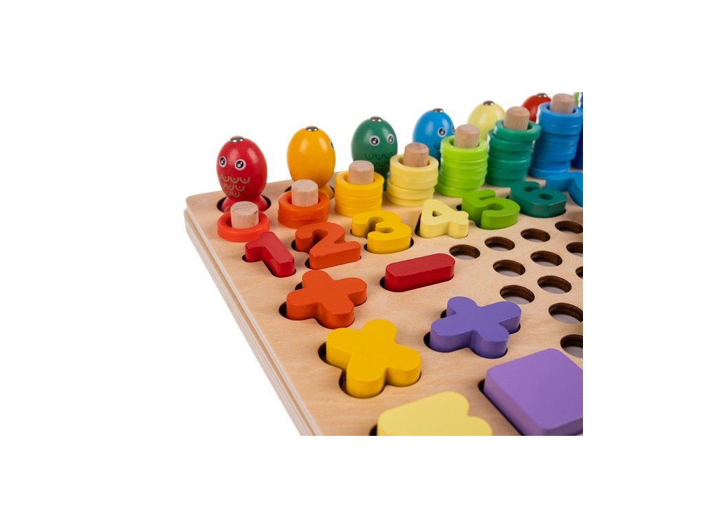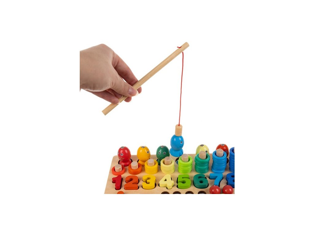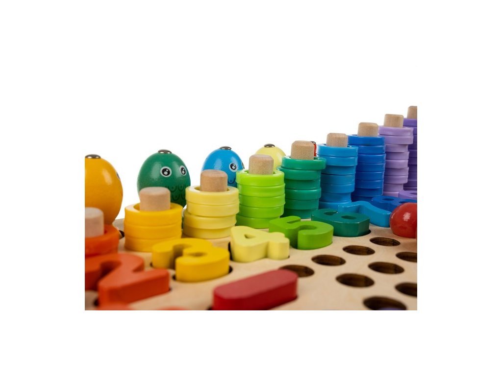 - materiál: lipové dřevo + koule: dřevo + PE kruhy + čísla, geometrické obrazce, znaky matematických operací MDF + rybí dřevo + železo + PE formy + oboustranné desky papír + palice dřevo + kleště dřevo + lžíce dřevo + rybářský prut dřevo + PP + PS + magnet