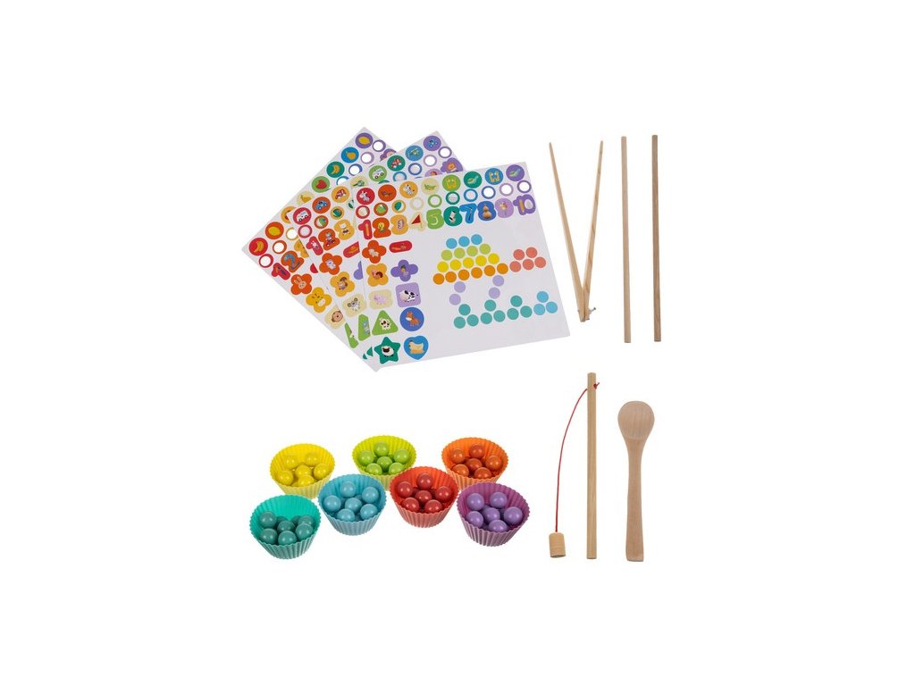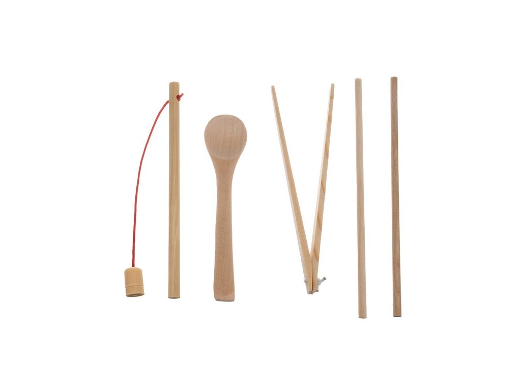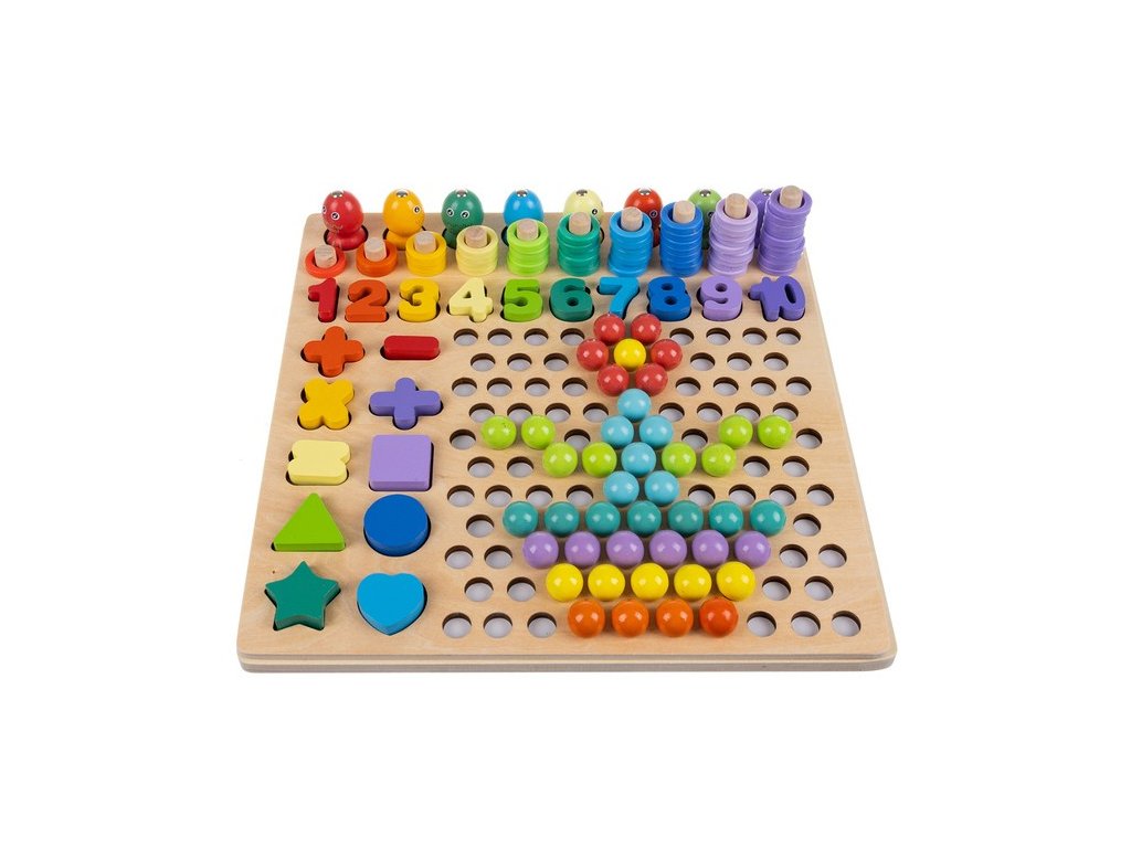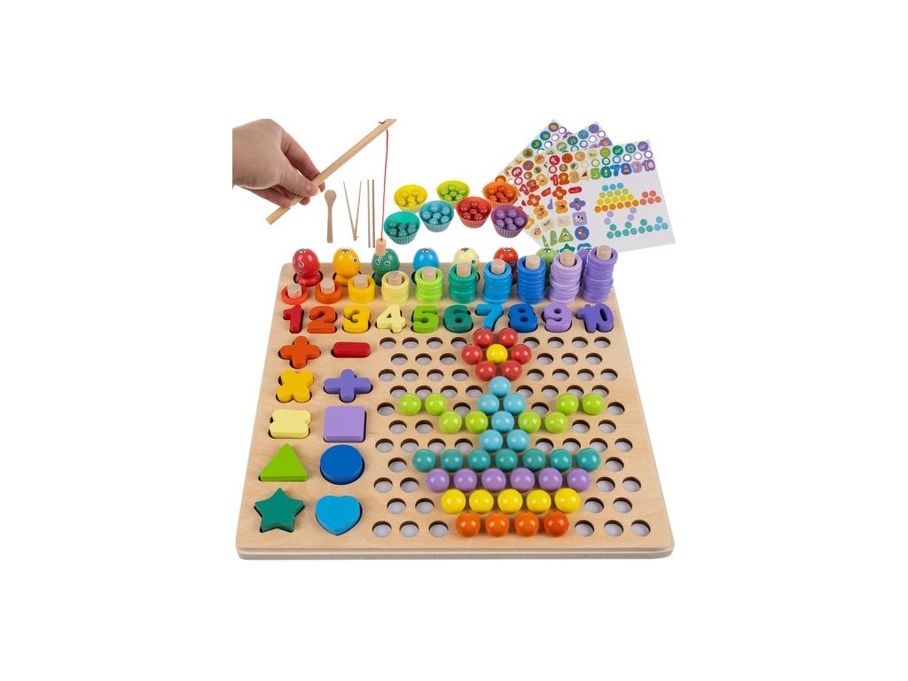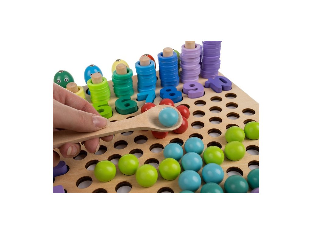 - materiál: lipové dřevo + koule: dřevo + PE kruhy + čísla, geometrické obrazce, znaky matematických operací MDF + rybí dřevo + železo + PE formy + oboustranné desky papír + palice dřevo + kleště dřevo + lžíce dřevo + rybářský prut dřevo + PP + PS + magnet