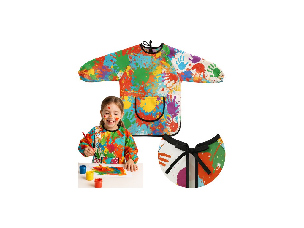 - účinně chrání oblečení - malířská zástěra pro děti je vyroben vyrobeno z nepromokavého materiálu, který chrání oblečení před barvou, lepidlem a inkoustem , dlouhé rukávy a volný střih poskytují plné krytí - ideální pro mateřskou školu i domácí aktivity