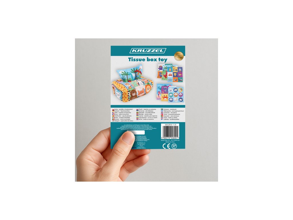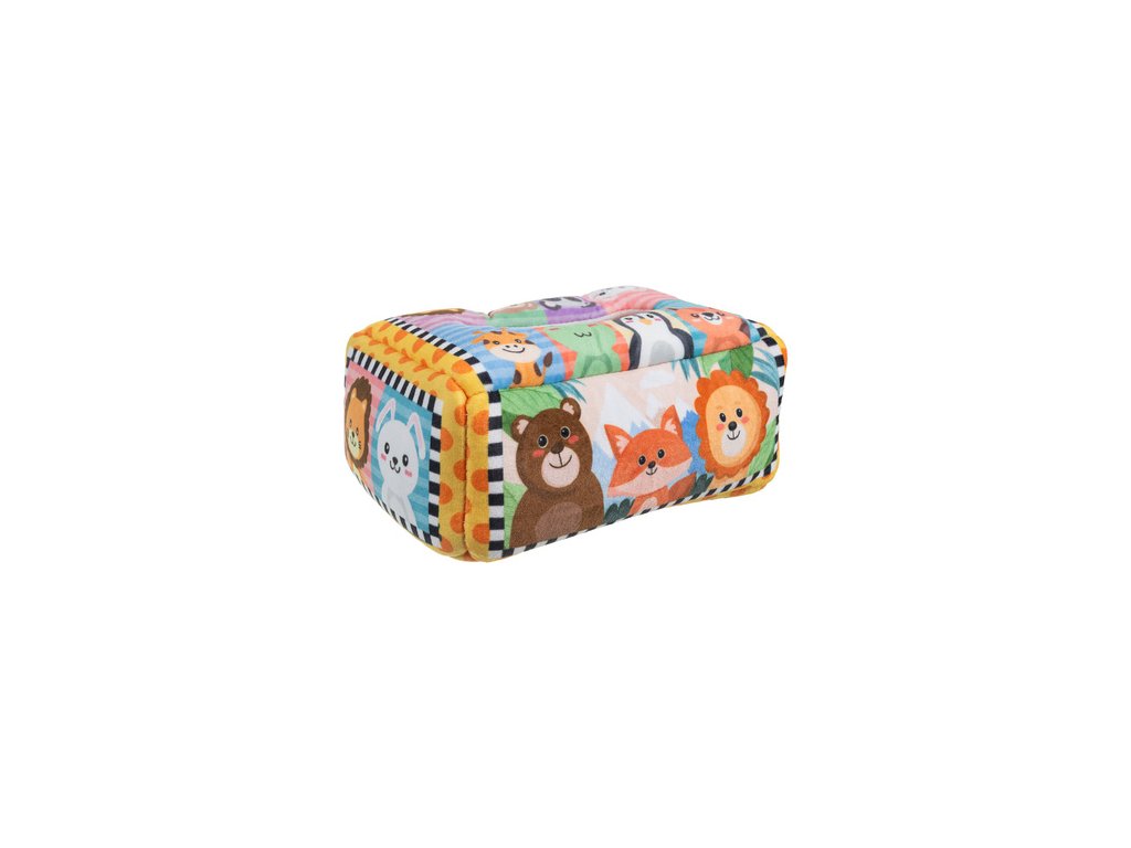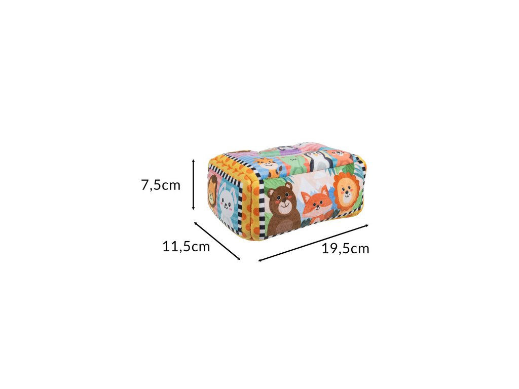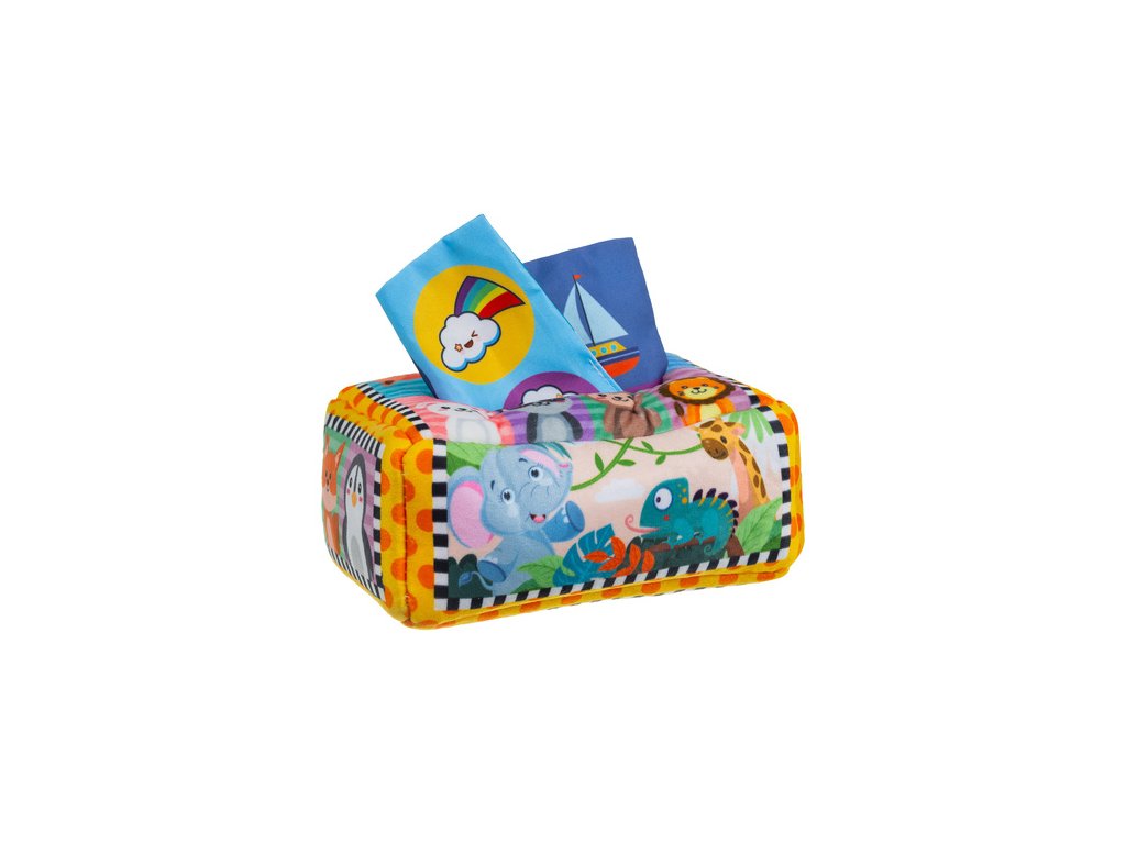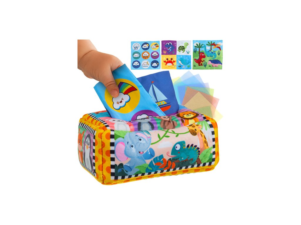 podporuje každodenní vývoj dítěte - třídič v podobě látkové krabice s kapesníky je praktická a vzdělávací hračka , která pomáhá nejmenším rozvíjet manuální dovednosti, koordinaci ruka-oko a také učí rozpoznávání barev, textur a sekvencí