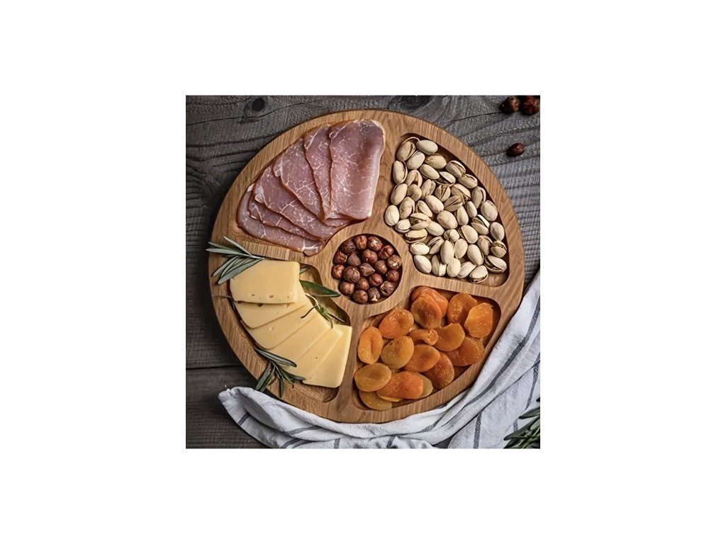 ?? 5 výdejních míst – deska je velká a má 5 samostatných servírovacích komor, které umožňují esteticky podávat různé občerstvení, jako jsou sýry, uzeniny nebo ovoce, bez rizika jejich smíchání