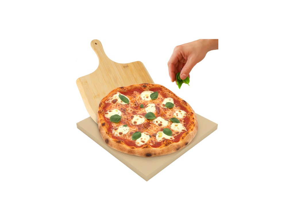 Ruhhy kámen na pizzu 38×36 cm s bambusovou špachtlí 2v1 kordierit