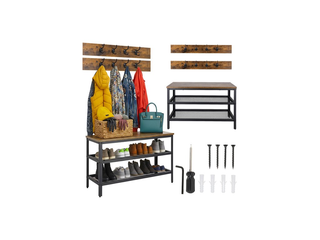Botník Ruhhy s ramínky - lavice se sedákem, 2 police + hnědá industriální loftová deska - do předsíně a šatny