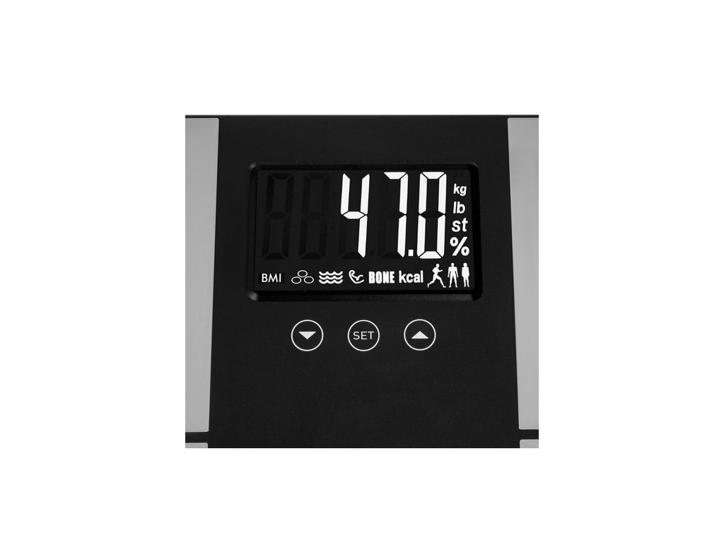 snadné použití a komfort použití - vytváření profilů je extrémně jednoduché Díky Tlačítko SET a šipky pro nastavení dat jako je věk (18-80 let), výška (100-220 cm) a úroveň aktivity, vše měření se provádějí ve stoje naboso na elektrodách
