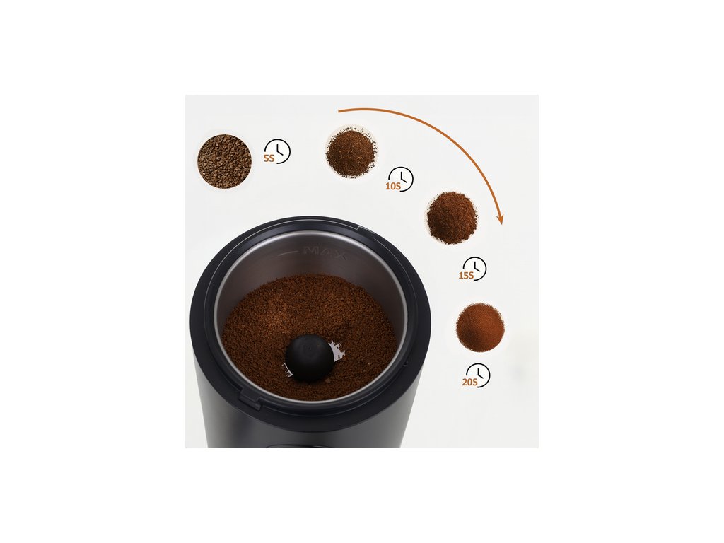 Díky inteligentnímu řízení času si sami určujete stupeň mletí – 5 sekund pro hrubé mletí, 20 sekund pro ultrajemné espresso , vše můžete vidět v reálném čase v průhledném okénku