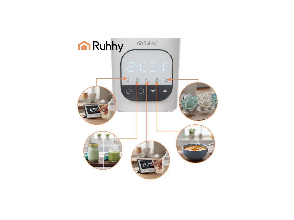 Multifunkční ohřívač RUHHY 5v1 je nenahraditelným pomocníkem pro každého rodiče - ohřívá mléko a jídlo, rozmrazuje, sterilizuje a pracuje rychle. Dotykový panel, přehledný displej a automatické vypnutí zajišťují intuitivní a bezpečné ovládání. Kompaktní, energeticky úsporný a vyrobený z bezpečných materiálů BEZ BPA - ideální pro každodenní použití doma i na cestách.