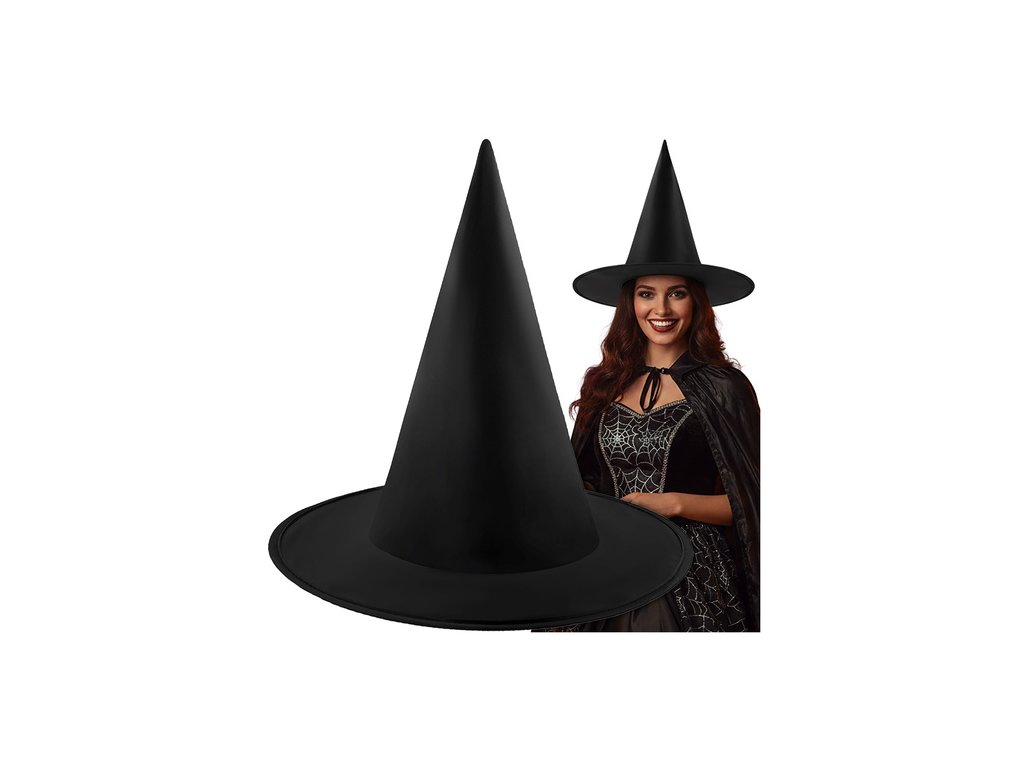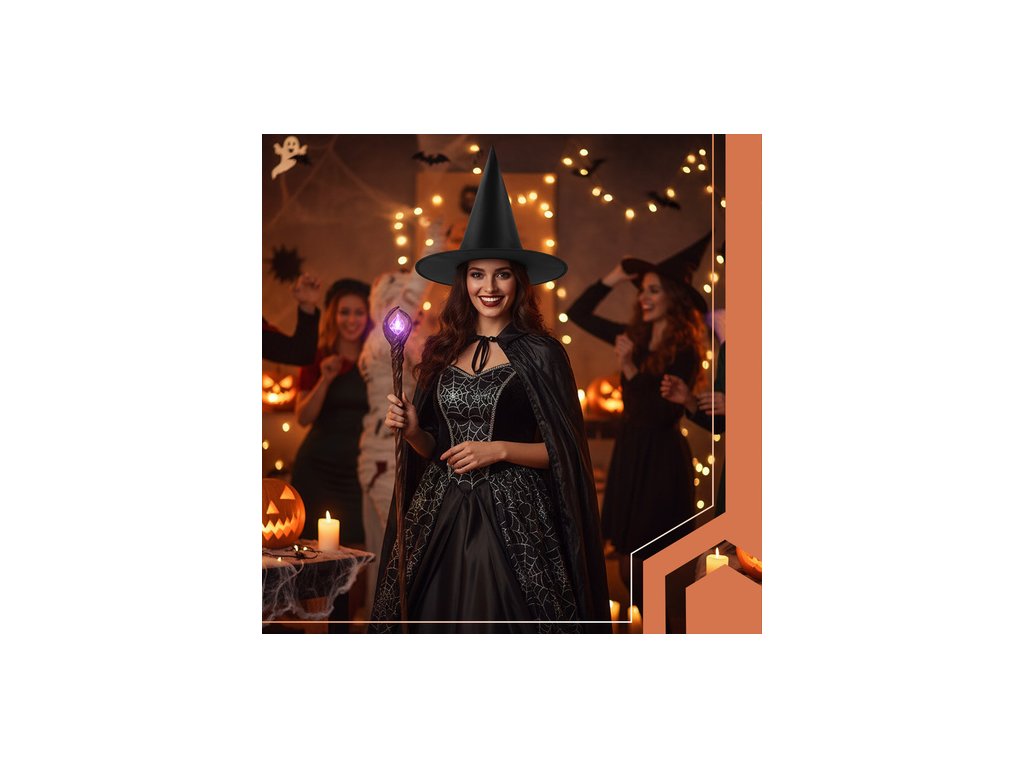 Klasický čarodějnický klobouk v tmavě černé barvě je perfektním doplňkem ke kostýmům čarodějnice, víly, kouzelníka nebo fantasy postavy. Kuželovitý tvar a široká krempa vytvářejí výrazný efekt, který přitahuje pozornost a dodává každému outfitu jedinečný nádech. Tento klobouk je lehký, pohodlný a všestranný. Je ideální na Halloween, kostýmní večírky, vystoupení, focení a tematické akce.