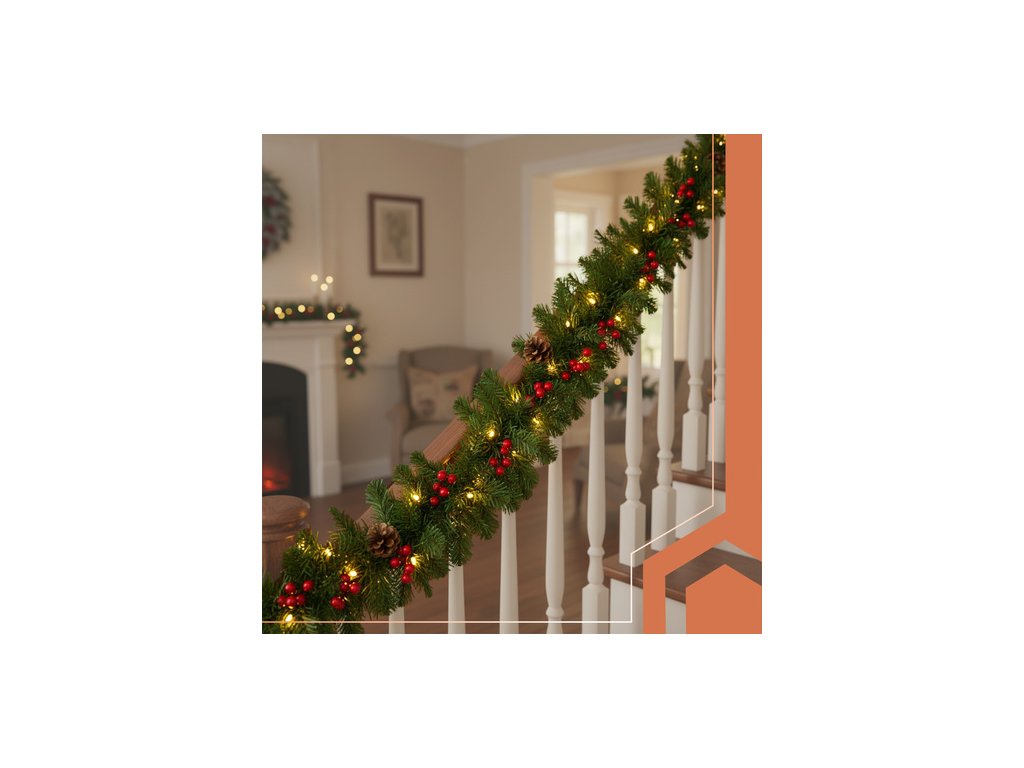 - PŮSOBIVÝ VZHLED + LED PODSVÍCENÍ - senzační vizuální efekt zajistí hustá a bohatě zdobená vánoční girlanda s podsvícením. Můžete ho omotat kolem zábradlí nebo s ním ozdobit příčky balustrády . Široké možnosti využití vánoční girlandy lze využít také jako dekoraci stolu, parapetu, krbové římsy nebo dveří.