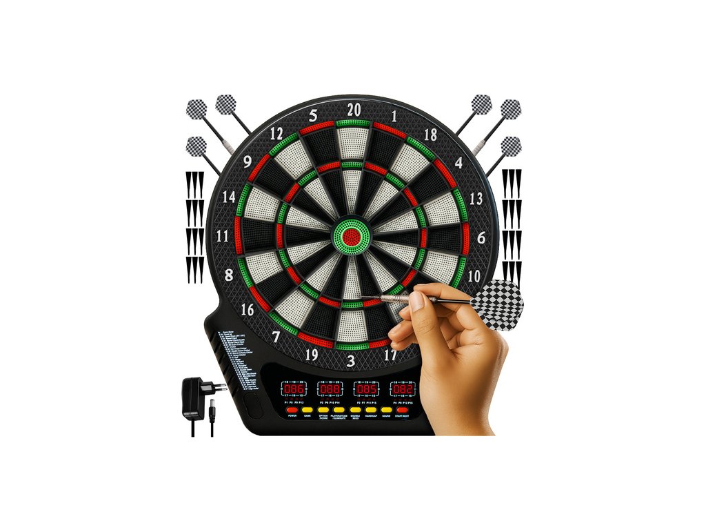Elektronická šipka Trizand se 4 LED displeji - pro 1-16 hráčů - 6 šipek s hliníkovými násadkami a 24 náhradními hroty - 8stupňové ovládání hlasitosti