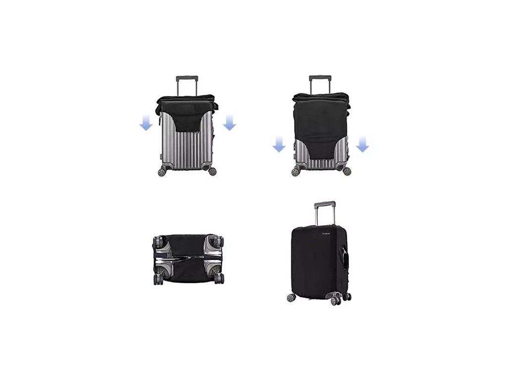 - PRAKTIČNOST S DOPLŇKOVÝMI FUNKCEMI - potah se velmi snadno nasazuje i sundává díky pružnému materiálu a zipům. Překryv má speciální otvory pro kolečka, madla kufru a výsuvná teleskopická rukojeť , která vám umožní volně používat kufr bez nutnosti sundávat kryt. Přídavný gumový pásek s přezkou zajišťuje lepší uchycení a zabraňuje sklouznutí potahu.