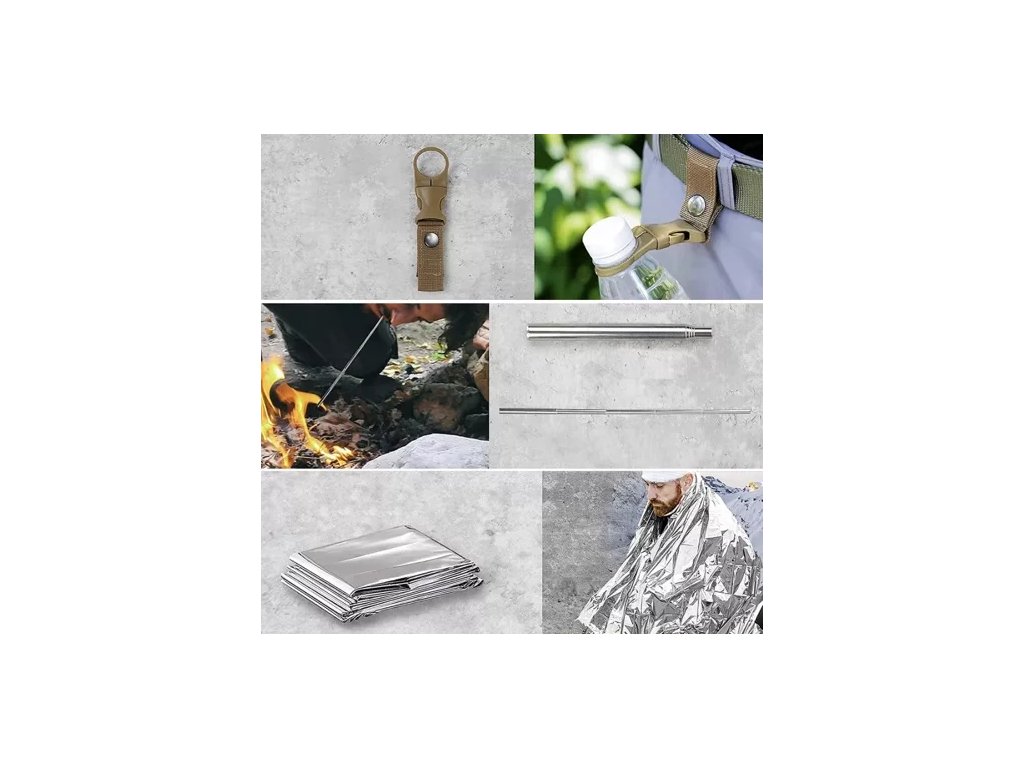 - 32 v 1 - sada obsahuje: strunová pila cca 60 cm dlouhá, zavírací nůž s pilou a řezačkou struny , taktické pero, karta přežití 11 v 1, zapalovač ohně s hořčíkovou tyčí a tác na sekání s cm stupnicí a otvírákem na láhve, svítilna - napájená AA baterií (baterie nejsou součástí balení), tepelná přikrývka 130x210 cm, uzamykatelná úložný kontejner, držák na láhev na opasek, paracordový pásek - cca 350 cm paracordu s kompasem, píšťalkou a podpalovačem - vše ve formě pásku, silikonová návnada 2 ks + vlasec + 2 háčky, náležitosti - lžíce s vidličkou a otvírákem na láhve + nůž, skládací plamenec, zapalovací struna 2 ks, karabina 2 ks Jedná se o velmi velkou sadu, která vám umožní přežít ve velmi obtížných podmínkách.