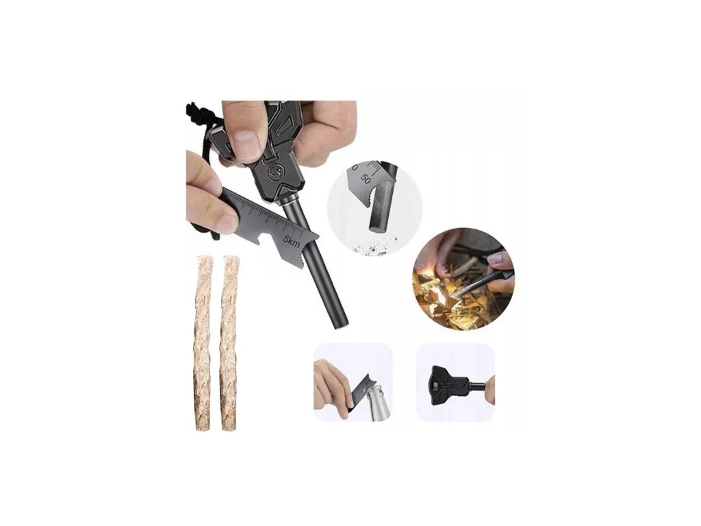 - podpalovač s hořčíkovou tyčí a úderným talířem s cm stupnicí a otvírákem na lahve