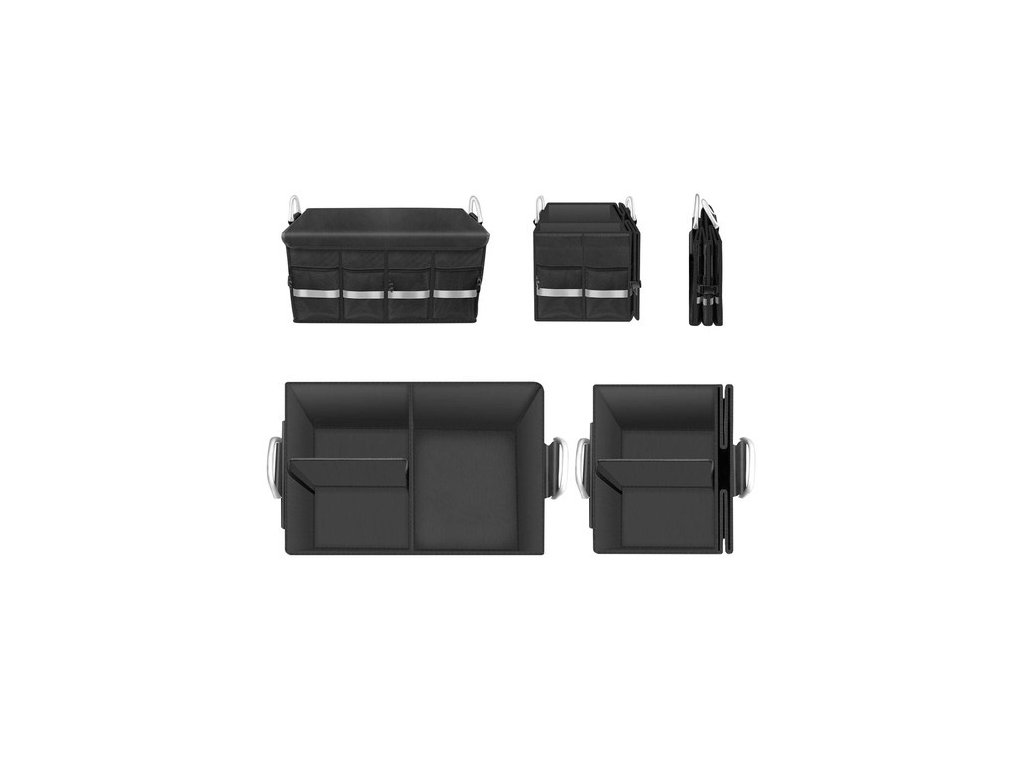 - SPECIFIKACE - barva: černá; vnější materiál: oxford tkanina, ostatní: polyester + nylon, vnitřní materiál: polyester, struktura: MDF, ostatní prvky: hliník + PP + materiál rukojetí: polyester, ostatní: PP + železo; kapacita: 50 l; rozměry rozloženého organizéru: 59 x 30 x 35 cm; hmotnost: 3,20 kg; hmotnost balení: 3,45 kg.
