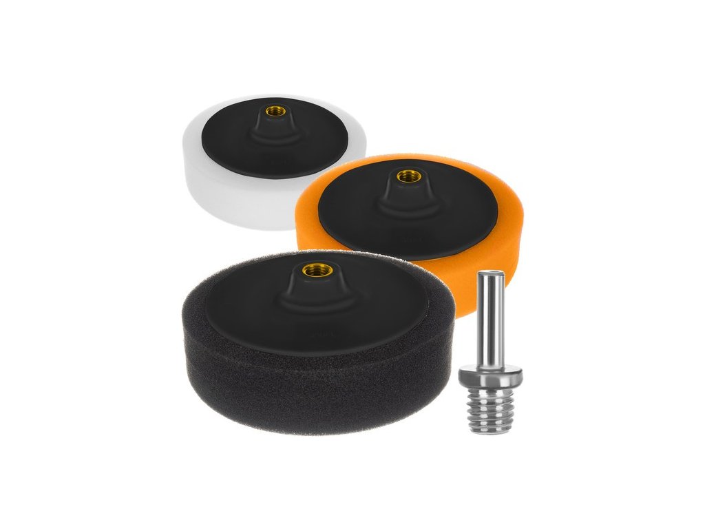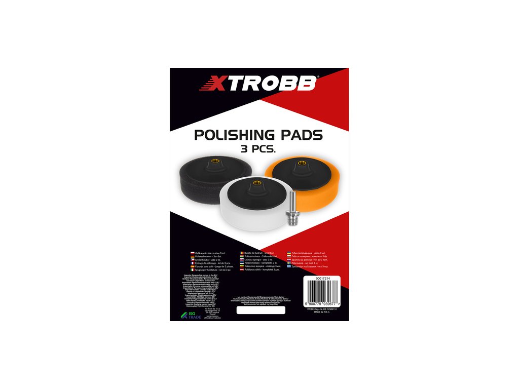 - SPECIFIKACE – výrobce: Iso Trade; značka: XTROBB; čep M14 / 8 mm; maximální rychlost otáčení: 3000 ot./min; materiál: polyesterová houba + ABS + železo; 3 druhy: černá – měkká, žlutá – střední, bílá – tvrdá; rozměry: 6/6/14,5cm; hmotnost sady: 0,255 kg.