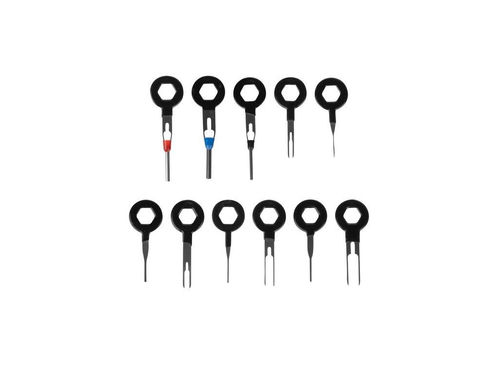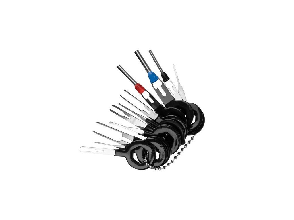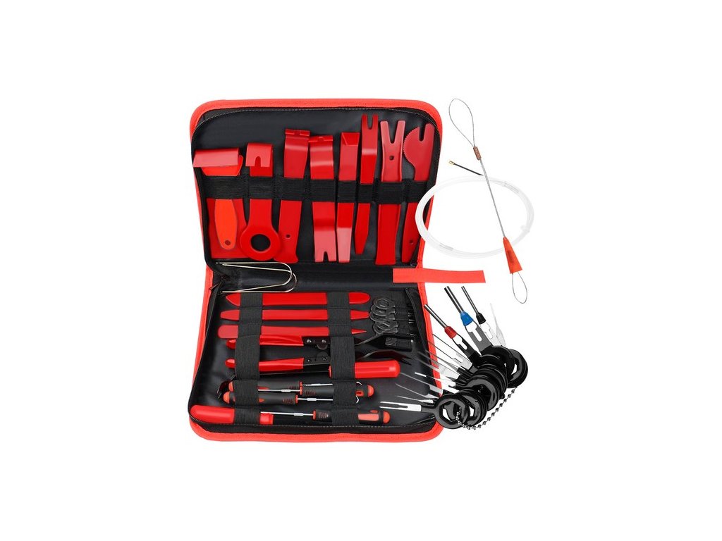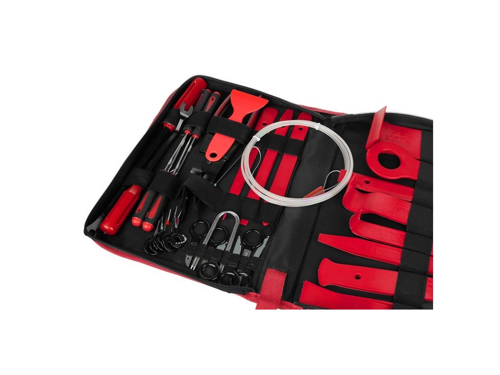 - ZAHRNUTO MNOHO POLOŽEK – sada stahováků na čalounění obsahuje mnoho prvků – kromě 12 stahováků na čalounění také kleště na špendlíky, 2 držáky klipů (22,5 a 31 cm), dále 8 vytahovačů rádia, 11 klíčů, pouzdro na zámek a 4 ks háčky pro odstranění těsnění.