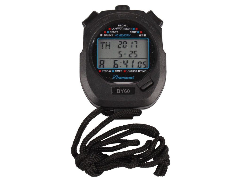 Kvalitní sportovní stopky Bramasmi BY60 s 60 mezičasy jsou praktickou pomůckou pro odměřování kratších časových intervalů. Využití najdou v celé řadě sportů, jako například běh, plavání, cyklistika, atletika, apod. Stopky BY60 jsou vhodné jak pro trenéry sportovců, tak pro učitele tělesné výchovy i sportovní kroužky. Funkce: - Čas, datum, budík, chronograf, odpočítávání; - Funkce desetinných stopek; - Zapnutí/vypnutí, tlačítko ztlumení, zobrazení teploty, indikace slabé baterie; - Třířádkový displej, rozlišení 1/100 za sekundu, počítání max. do 10 hodin; - 60 paměťových záznamů s mezičasy a časy kol.Doplňkové parametry