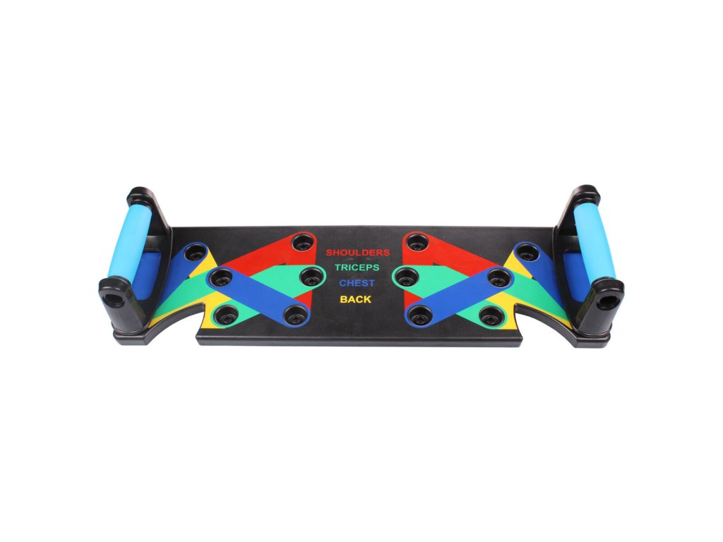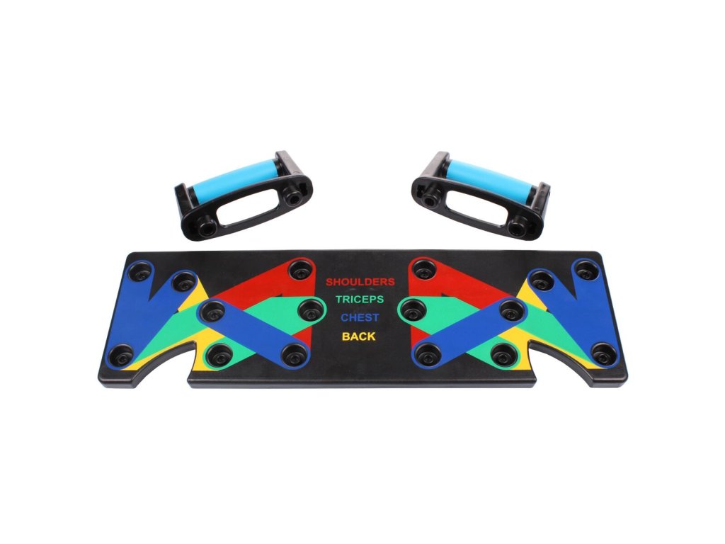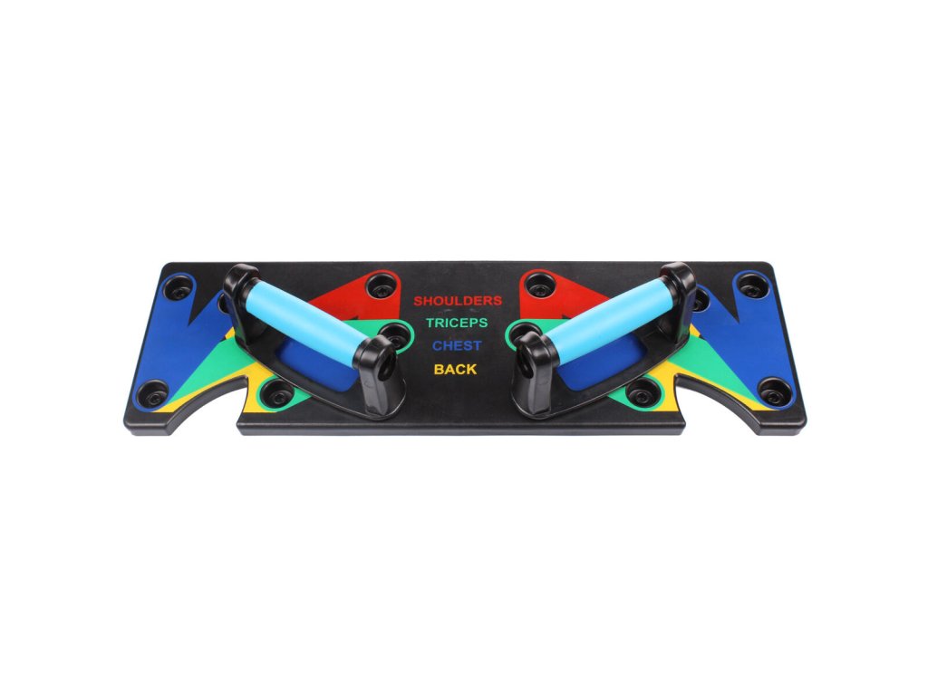 Multifunkční deska na kliky Merco Excellent je určená na cvičení a posílení tricepsů, prsou a zad. Stačí jednoduše nastavit přiložené opěrky podle barevně rozlišených poloh na desce a můžete začít cvičit. Deska i opěrky jsou vyrobené z odolného ABS plastu, opěrky jsou opatřené silikonovými protiskluzovými rukojetěmi. Tréninková deska Excellent má rozměry (D x Š x V) 60 x 18 x 2 cm a váží necelých 1,1 kg, rukojetě opěrek jsou široké 13 cm. Deska nabízí 10 nastavení poloh pro cvičení: 2 na ramena (červená barva), 3 na tricepsy (zelená barva), 3 na prsa (modrá barva) a 2 na záda (žlutá barva). Díky tomu je multifunkční deska Excellent ideální doplněk každé domácí tělocvičny či pro školy.Doplňkové parametry