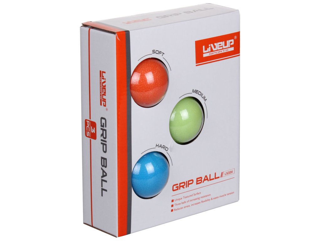 Sada posilovacích míčků LiveUp Grip Ball o průměru 5 cm je určena k posílení, rozvoji a obnově svalů ruky a k uvolnění nervového napětí. Sada obsahuje tři míčky z odstupňovanou tuhostí a texturovaným protiskluzovým povrchem. Všechny míčky jsou vyrobeny z na omak příjemné termoplastické gumy a díky kompaktnímu rozměru se snadno vejdou do kapsy. Posilovací míčky LiveUp Grip Ball jsou univerzální mobilní posilovací pomůckou, kterou využijete kdykoliv a kdekoliv, a která přináší rychlý účinek. Hmotnost jednoho míčku je 60 g.Doplňkové parametry