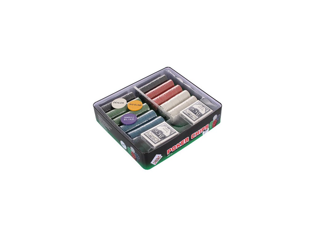 Milujete hazard a napětí? Umíte blafovat a držíte si pokerovou tvář? Poker box 500 sada na poker je přesně pro vás. Důležitá je taktika a trochu štěstí. Pozvěte kamarády a začněte vymýšlet pokerovou taktiku, hráč který má nejvyšší kombinaci vyhrává. Kompletní set na poker je vhodný pro začínající i pokročilé hráče, kteří na tuto hru nedají dopustit. Případně si zahrajte světoznámý Black Jack. Sada obsahuje všechny důležité komponenty od hracího plátna až po 500 kusů žetonů a dva balíčky žolíkových hracích karet, vše naleznete v praktické kovové krabičce. Obsah balení: 500 ks žetonů v hodnotách 1 – 50 1 kus – žeton Small blind 1 kus – žeton Big blind 1 kus – žeton Dealer Látkové plátno o rozměrech 90 x 58 cm. Dvě krabičky karet.Doplňkové parametry