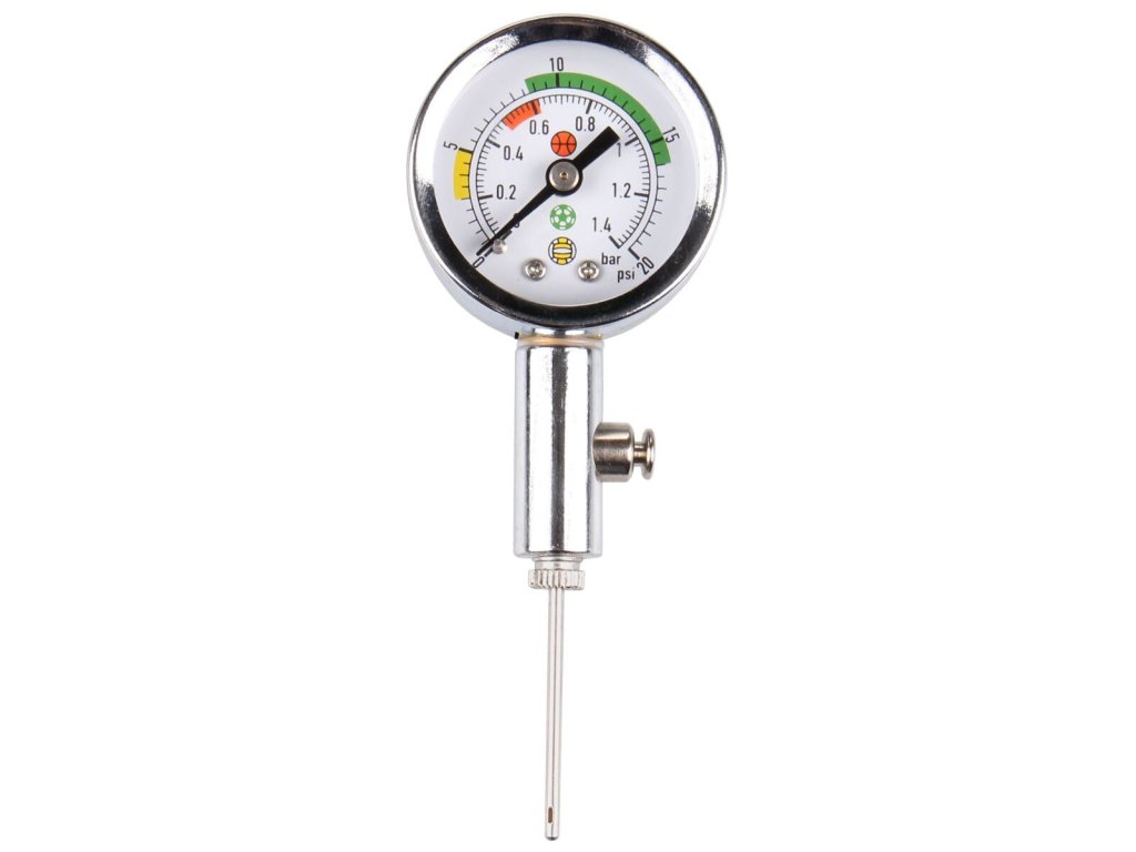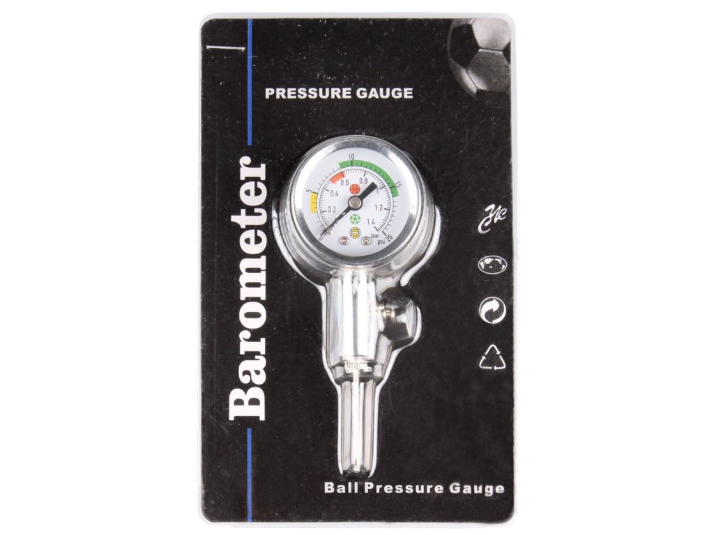 Kovový tlakoměr s budíkem je praktická pomůcka, s jejíž pomocí snadno a rychle změříte tlak v jakémkoli typu sportovního míče. K tlakoměru pouze jednoduše našroubujete jehlu, která je součástí balení. Měřič tlaku míčů Pressure Ball má stupnici 0 - 1,4 bar a 0 - 20 psi. Na stupnici jsou barevně vyznačené doporučené hodnoty tlaku pro základní typy míčů (volejbal, basketbal, fotbal). Tlakoměr by měl patřit do základního vybavení každého sportovního klubu a každé školy. Upozornění: tlak v míčích kontrolujte vždy pouze s navlhčenou jehlou, aby nedošlo k poškození míče!Doplňkové parametry