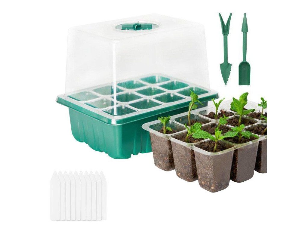 Rádi zahradničíte a pěstujete si vlastní rostlinky ze semínek? Pak je pro vás ideální minipařeniště Seedling Pot 12. Tento malý skleníček se používá pro předpěstování sazenic, řízkování rostlin a klíčení semínek. Seedling Pot 12 je vyrobený z PET plastu a skládá se ze zelené podmisky, průhledné vložky na sazenice s otovory pro odtok vody, průhledného víka, na kterém se dá nastavit proudění vzduchu, 20 zápichů pro označení sazenic a plastového mini zahradnického náčiní. Každé minipařeniště má 12 otvorů pro sazenice a celý set Seedling Pot 12 obsahuje 10 kusů minipařenišť. Jedno minipařeniště má rozměry 18,5 x 16 x 14,5 cm (ŠxVxD) a velkou výhodou oproti konkurenčním minipařníkům je dostatečně vysoké víko. Návod: 1) Navlhčete zeminu, nejlépe rozprašovačem. 2) Plastovou mini lopatkou naplňte otvory zeminou. 3) Mini sázecím kolíkem vytvořte důlky pro semínka nebo řízky. Semínka umístěte do důlků. 4) Můžete použít bílé zápichy pro označení rostlinek. 5) Pařeniště přiklopte průhledným víkem a zeleným kolečkem nastavte proudění vzduchu (mikroklima). 6) Pravidelně vlhčete zeminu, můžete přidat i hnojivo. 7) Pařeniště umístěte na světlé a teplé místo. 8) Pro vyjmutí sazenic můžete využít druhý přiložený mini nástroj. Tipy: Označte si všechna semínka. Použijte kvalitní zeminu, můžete se tak vyhnout případným škůdcům a plesnivění rostlin. Doporučujeme do každého květníčku zasadit 2-3 semínka, abyste zvýšili šanci na úspěšné pěstování. Před vyjmutím sazenic z květníčků nechte zeminu mírně proschnout, půjdou pak lépe vyjmout. Obsah balení: 10 ks zelených podmisek 10 ks průhledných vložek s květníčky (1 květníček má rozměr 3,8 x 3,8 x 5,5 cm) 10 ks průhledných víček 10 ks koleček pro úpravu mikroklimatu v pařeništi 20 ks štítků na označení rostlin 2 ks mini zahradního náčin Materiál: PET plastDoplňkové parametry