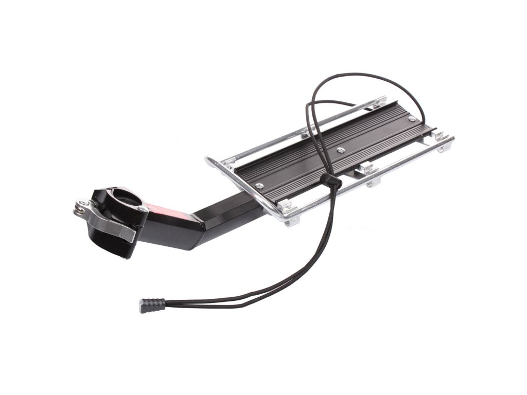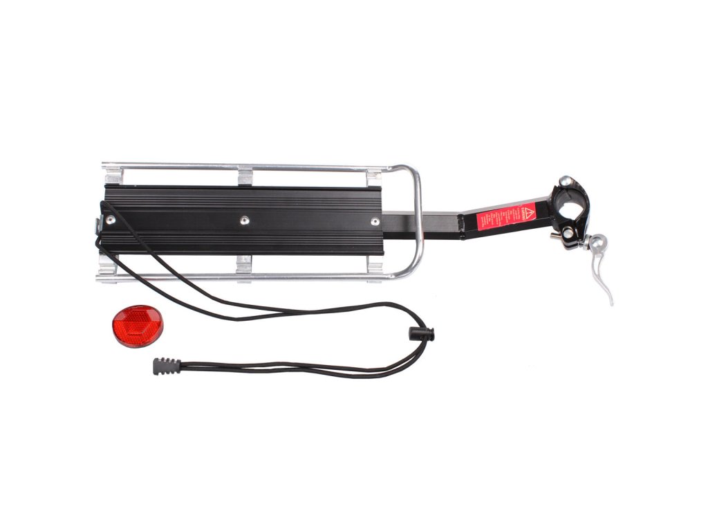 Hliníkový nosič na sedlovku Merco Shelf pro převoz nejrůznějšího nákladu a zavazadel je určený především pro kola, u kterých není možné pod sedlo připevnit standardní nosič. Například když chcete nosičem vybavit celoodpružené kolo. Konstrukce nosiče je tvořená robustním ocelovým nosníkem, na němž je přinýtovaný lehký hliníkový profil s nákladovou plochou 30 x 12 cm. Přivařená dělená objímka s rychloupínákem pak umožňuje snadné nasazení nosiče bez nutnosti vyjmutí sedlovky z rámu. Shelf nosič lze bez použití dalších nástrojů připevnit ke všem sedlovkám s průměrem 28 – 38 mm. Součástí nosiče je gumolano a bezpečnostní odrazka, kterou prostým nasunutím připevníte do příslušného držáku na zadní straně nosiče. Nosič Merco Shelf není určený pro přepravu osob. Jeho maximální nosnost je 9 kg a celková hmotnost celokovového nosiče je pak přibližně 600 gramů.Doplňkové parametry
