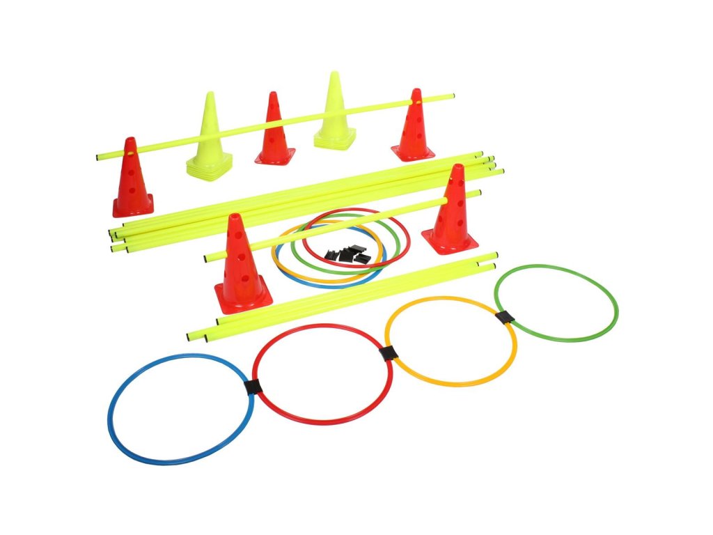 Tréninková agility sada Merco Skillfiter je jednoduchá a praktická pomůcka pro vytvoření překážkové dráhy na jakémkoli povrchu ve vnitřním nebo venkovním prostoru. Tato sada obsahuje celkem 18 kuželů s otvory o výšce 30 cm, které můžete kombinovat s přiloženými tyčemi o délkách 100 cm a 160 cm a průměrem 25 mm. Dále jsou zde také kruhy s průměrem 40 cm, díky kterým si vytvoříte jednoduchou dráhu. To vše je dodávané v praktickém polyesterovém vaku se zapínáním na šňůrku a dvěma popruhy pro snadné přenášení celé sady přes rameno. - 5x červený kužel s otvory a výškou 30 cm - 13x žlutý kužel s otvory a výškou 30 cm - 4x tyčka 100 cm - 9x tyčka 160 cm - 8x kruhy s průměrem 40 cm - praktický vak se šňůrkou - hmotnost sady cca 6,8 kg - pro indoor i outdoor použití - materiál: plastDoplňkové parametry
