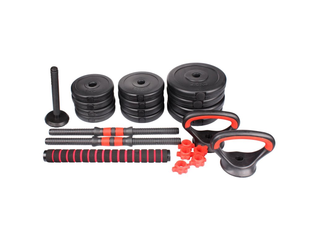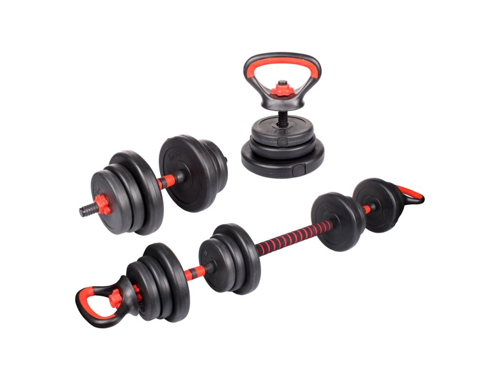 Merco Variable je skvělý fitness set na domácí cvičení a kondiční trénink. Díky možnosti nastavení hmotnosti až do 20 kg si snadno přizpůsobíte zátěž dle svých možností. Sada obsahuje mix kotoučů a os, díky kterým si vytvoříte individuální trénink dle svých představ! Sestavit si můžete dvě jednoruční činky nebo jednu dlouhou obouruční činku. S pomocí přiložených madel můžete mít klasický kettlebell či je můžete použít jako konce činky a ozvláštnit si tak svůj trénink. Celá sada je vyrobená z odolného plastu a výplň kotoučů tvoří cement. - sada: 2x osa, 1x spojovací část, 2x madlo, 1x tyč pro kettlebell, 5x uzávěr, kotouče 4x 1 kg, 4x 1,25 kg, 4x 2,5 kg - materiál: plast, cement - osa: 46 x 2,5 cm (délka x průměr) - spojovací část: 39,5 cm - madlo: 19 x 13 cm (šířka x výška) - kotouč 1 kg: 16 x 3 cm (celkový průměr x šířka) - kotouč 1,25 kg: 17,5 x 3 cm (celkový průměr x šířka) - kotouč 2,5 kg: 22 x 3,5 cm (celkový průměr x šířka)Doplňkové parametry