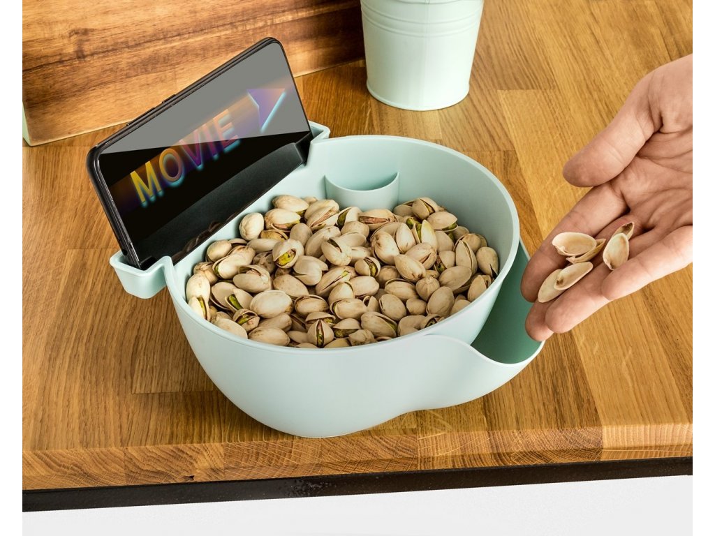 Výborná miska z vysoce kvalitního materiálu. Dvouvrstvá konstrukce usnadňuje konzumaci potravin. Je naprosto vynikající pro podávání pistácií, slunečnicových semínek a dalších potravin, jako jsou čerstvě umytá rajčata, hrozny, jahody nebo třešně. Díky držátku na telefon můžete pohodlně svačit při sledování videí.