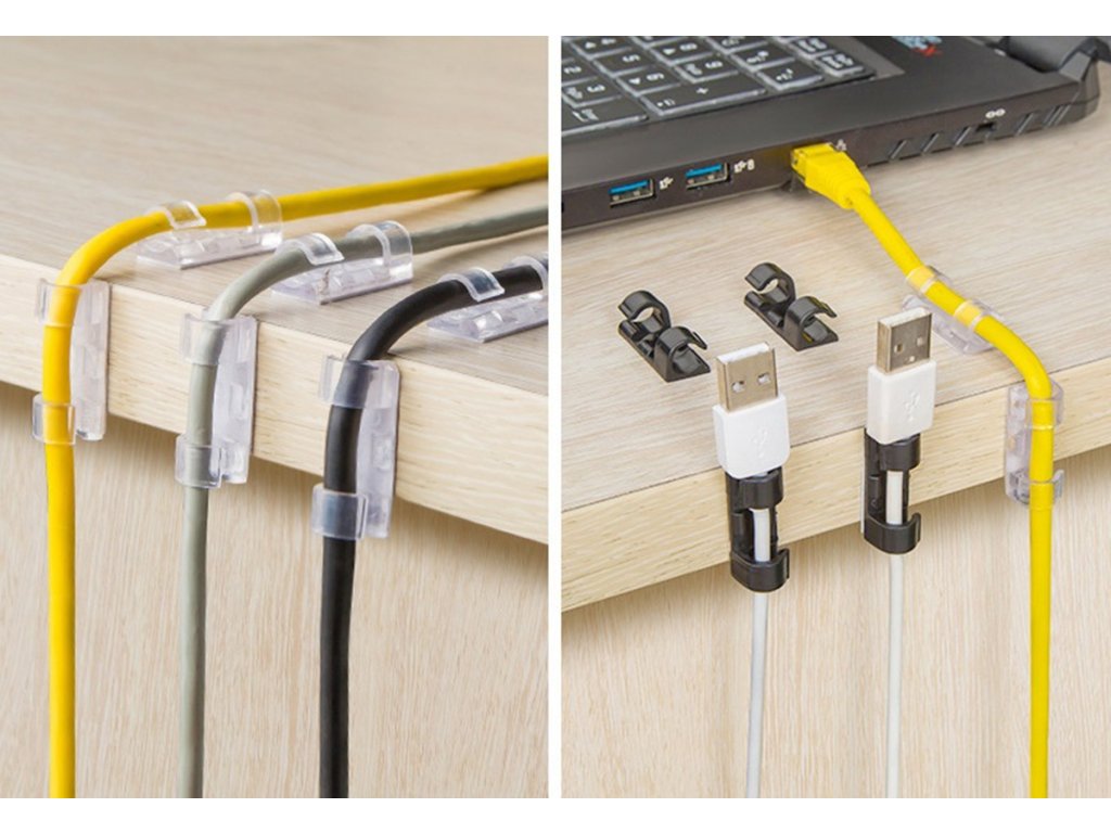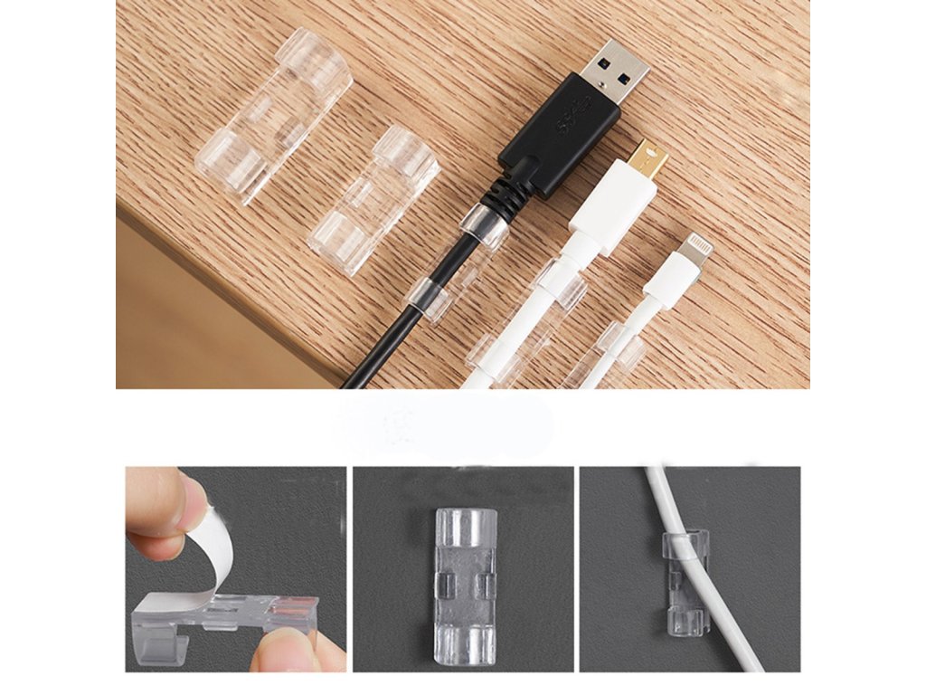 Samolepící věšák/klip sloužící jako organizér kabelů. Zabraňuje zamotání kabelů a usnadňuje jejich úhlednou organizaci. Je velmi odolný - po nalepení pevně drží na povrchu díky použití 3M oboustranné pásky.