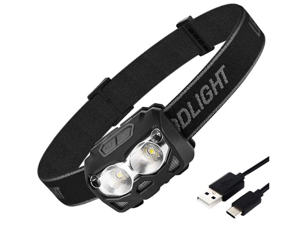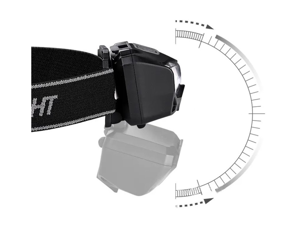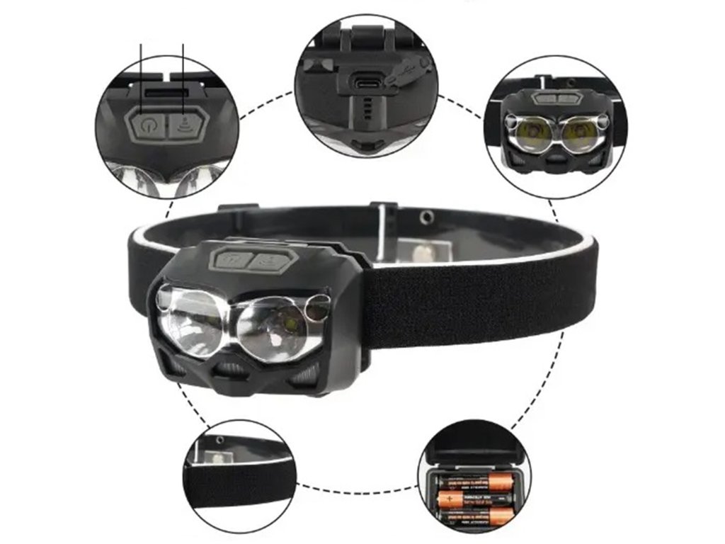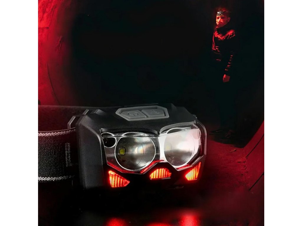 Čelovka XPE LED s až 2 silnými diodami a 3 červenými LED. Pouzdro je vyrobeno z odolného plastu. Svítilna má silný světelný zdroj s životností až 100 000 hodin. Pevná, pevná rukojeť zajišťuje pohodlné používání. Zařízení využívá vyměnitelnou baterii, kterou lze snadno nabíjet pomocí přiloženého USB kabelu. Svítilna je také vodotěsná a nárazuvzdorná. Spínač je chráněn pevnou gumou a O-kroužky chrání zařízení před nečistotami a prachem.