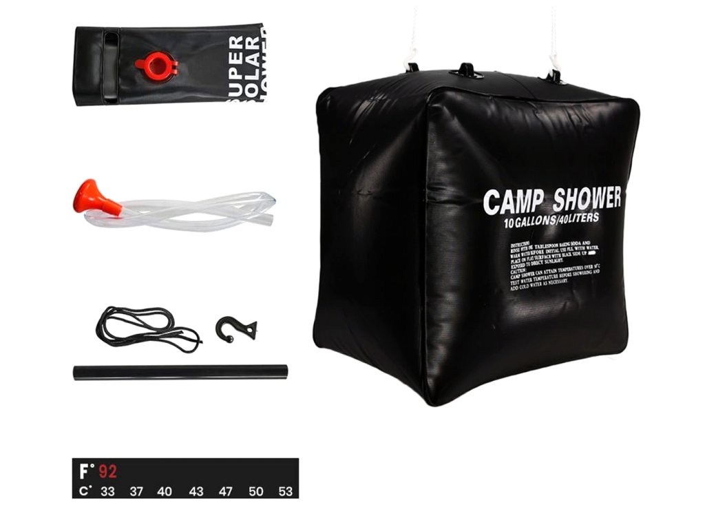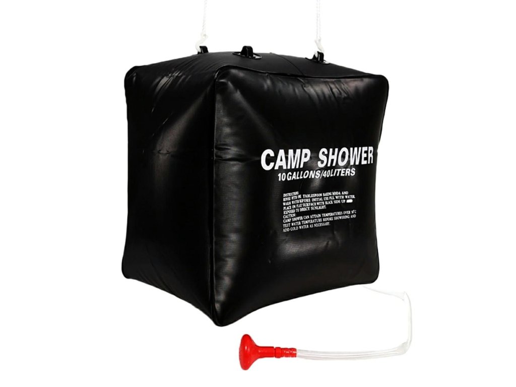 Závěsná kempingová sprcha s objemem až 40 litrů. Je ideální pro jakýkoli kemp, výlet nebo zahradní nábytek. Nenahraditelný všude tam, kde není možné použití tekoucí vody. Speciální materiál umožňuje ohřátí vody na příjemnou teplotu.
