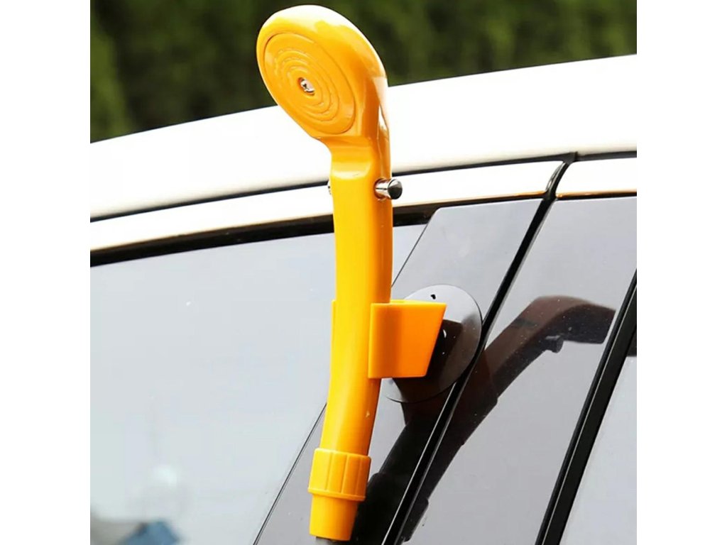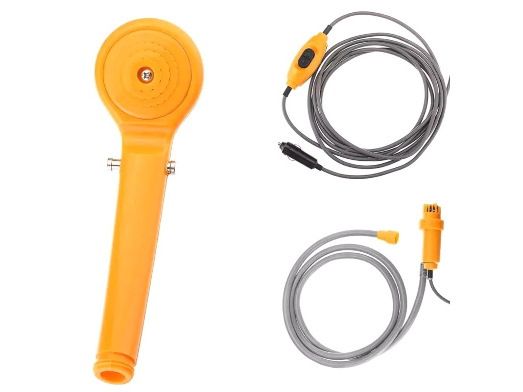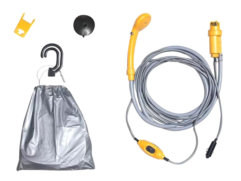 Přenosná cestovní sprcha s účinnou pumpou. Stačí jej zapojit do 12V zásuvky zapalovače v autě a užít si pohodlnou venkovní koupel. Sluchátko je vybaveno speciální přísavkou a montážním háčkem pro pohodlné zavěšení a má také možnost plynule regulovat průtok vody. Dlouhá sprchová hadice a napájecí kabel zvyšují komfort používání. Čerpadlo má vestavěný filtr (čistitelný) a hermetický spínač chráněný proti vodě. Zařízení je ideální pro jakýkoli kemp, výlet nebo pozemek. Nenahraditelný všude tam, kde je nemožné použití tekoucí vody.