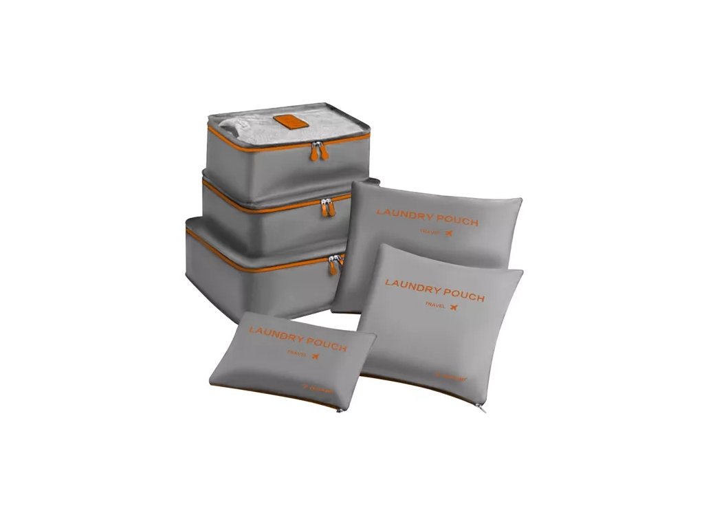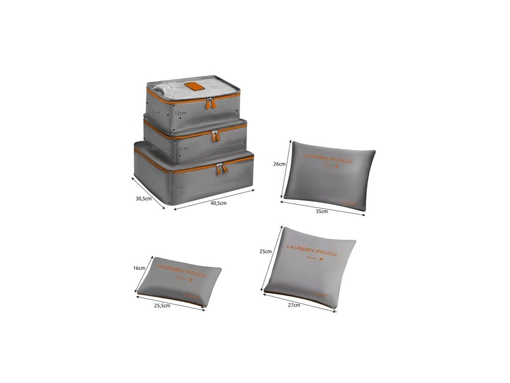 - SPECIFIKACE - barva: šedá / oranžová; materiál: polyester, ostatní: plast + silikon; rozměry organizérů: 21 x 30,5 x 12 cm; 27 x 32 x 12 cm; 40,5 x 30,5 x 12 cm; 26 x 35 cm; 25 x 27 cm; 16 x 25,5 cm; hmotnost: 223 g; hmotnost v balení: 238 g.