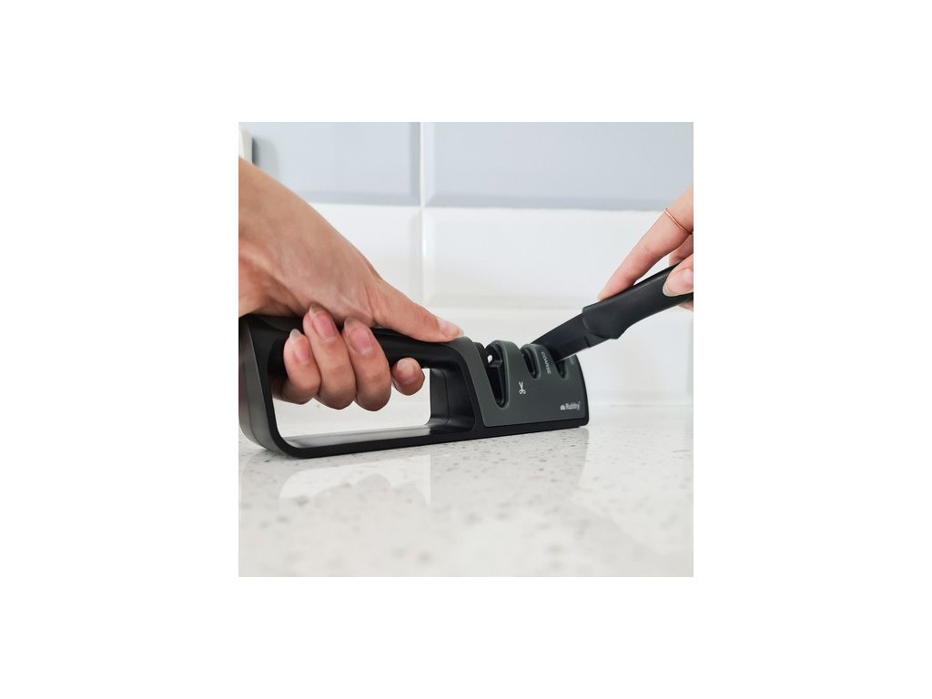Už žádné tupé nože v kuchyni, které vám zaneřádí kuchyňskou zásuvku a jsou zcela zbytečné. Brousek na nože a nůžky je řešení, které jednou provždy odstraní problém s neostrými noži v každé kuchyni. Ruční brousek na nože a nůžky se snadno používá a velmi rychle a efektivně ostří všechny typy čepelí. Brousek nože je kompaktní velikosti. Když se nástroj nepoužívá, lze jej snadno schovat do kuchyňské skříňky nebo zásuvky - zabírá velmi málo místa.