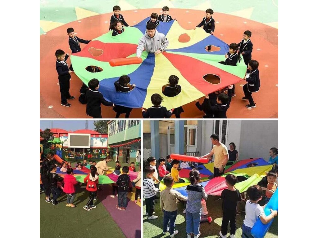 Didaktická pomůcka Merco Parachute Play je určená především pro hry a rozvoj koordinace celé skupiny zúčastněných kolem padáku, pod ním nebo po jeho ploše. Padák pomáhá procvičovat smysl pro souhru. Je tak vhodný zejména pro učitele nebo táborové vedoucí k organizování aktivit celé skupiny dětí, ať už v přírodě nebo ve vnitřních prostorách tělocvičny. Parachute je vyroben z velmi lehkého polyesteru, sešitý z pastelově barevných dílů s lemovanými kruhovými otvory s průměrem 30 cm a jedním otvorem přímo uprostřed. Po celém vnějším obvodu se nalézají poutka pro uchopení a napnutí kruhu. Součástí balení jsou i čtyři 100 cm dlouhé nafukovací kyje pro oblíbenou dětskou hru „na krtka“, kdy se jeden z hráčů nachází ve středovém otvoru kruhu a usiluje o zasažení kyjem co možná největšího počtu „krtků“, kteří vystrkují hlavy z děr okolo ve chvíli, kdy je hráč s nafukovacím kyjem uprostřed nepozorný. Průměr celého kruhového padáku se liší v závislosti na jedné ze dvou nabízených velikostí. Průměr Počet otvorů Počet dílů Počet dětí 4 m 9 8 10 – 20 5 m 13 12 15 – 30Doplňkové parametry